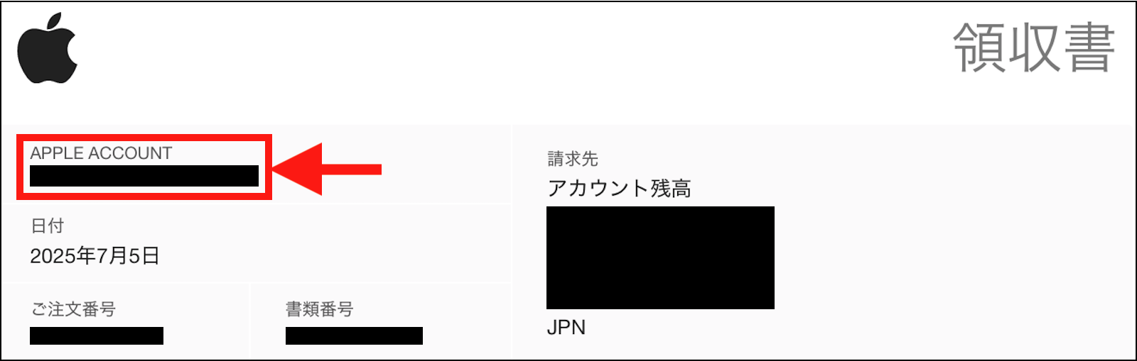 「購入履歴」は、アプリのダウンロード時に使用した Apple Account に紐付けされますので、Apple から「領収書」メールが届いている場合は、「領収書」メールに記載されている Apple Account(下の画像赤枠部分)と、現在サインインしている Apple Account が異なっていないか確認 して見て下さい。
