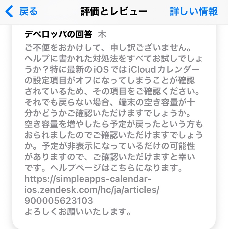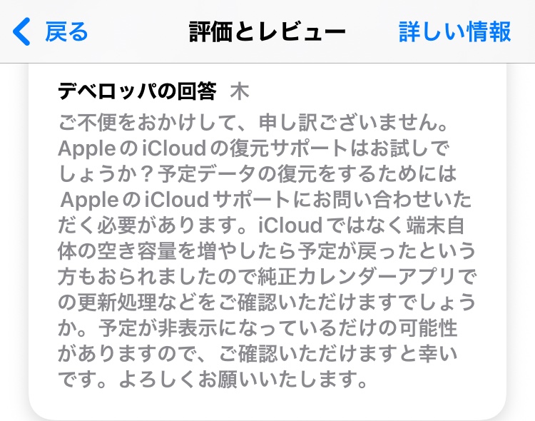 シンプルカレンダーというアプリを2年ほど利用しており、今日突然過去の予定から未来の予定まで全て突然なくなりました。アプリに問い合わせるとタイトルのように聞いてた指示があり、聞いてみました。そのようにいうと復元してくれると言っていたので、