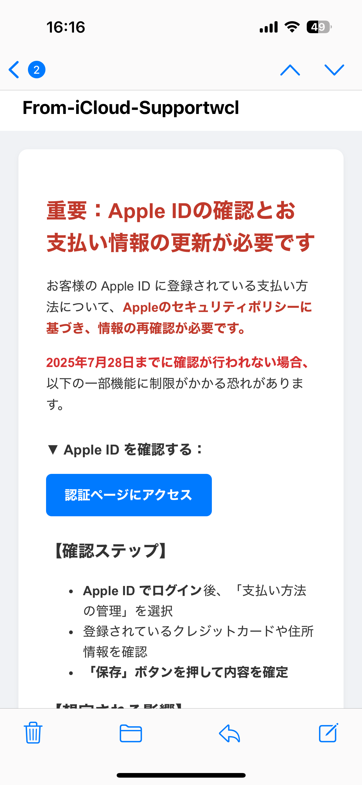 スレッドに付いたマーク ランキングトップの返信 ユーザのユーザプロフィール: 焼肉 焼肉 ユーザレベル: レベル 6 15,052 ポイント 2025/07/28 00:27 ゆ0207 への返信 詐欺ですので操作しないようにしてくださいAppleからのメールが本物かどうか不… - Apple コミュニティフィッシング詐欺メールの見分け方 - Apple コミュニティディジタル認証でAppleからのメール… - Apple コミュニティ 返信 リンク