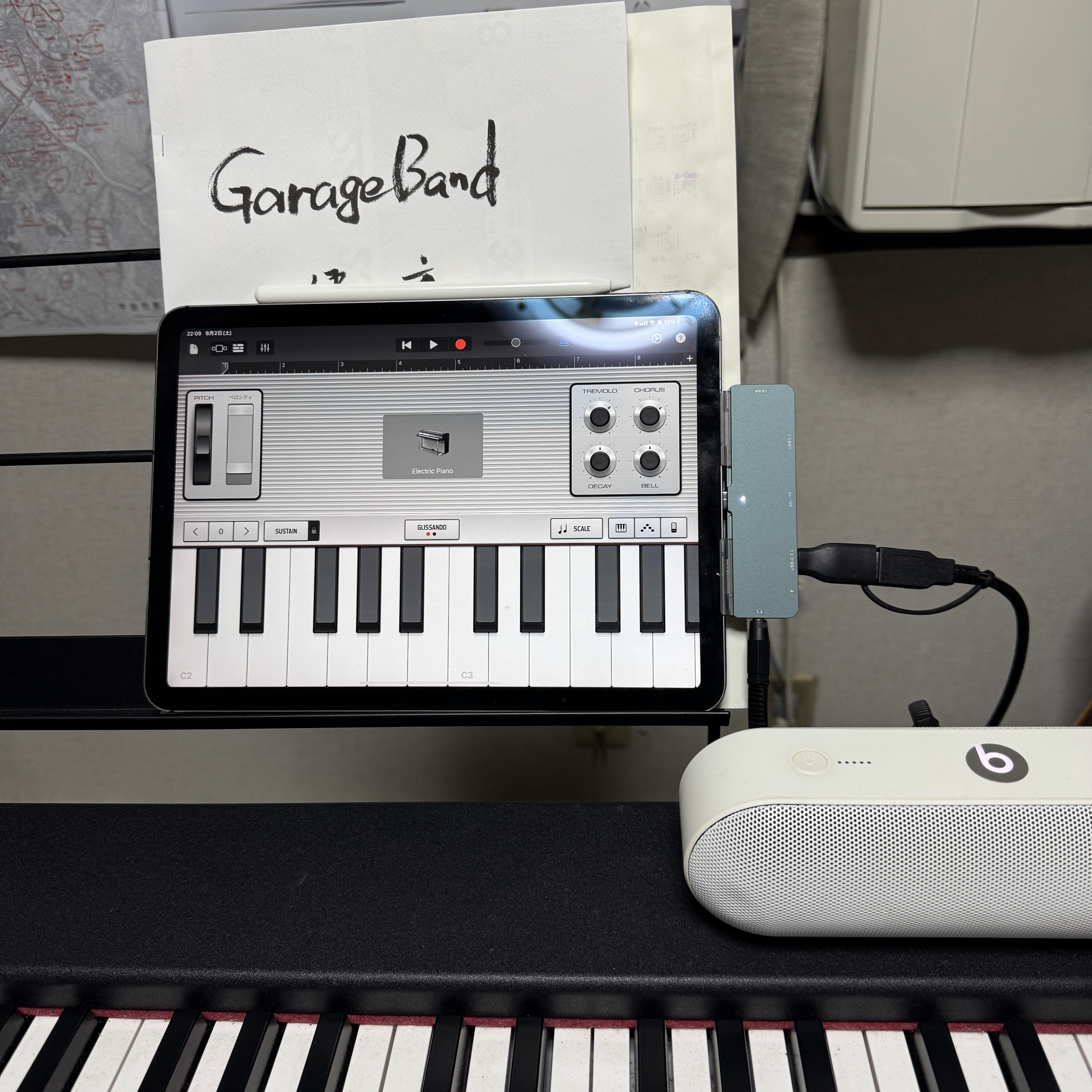 いちいちパソコンを持っていけない。iPadAir(第4世代)のGarebeBandに繋げば、一応小さいながらも音声はでますが