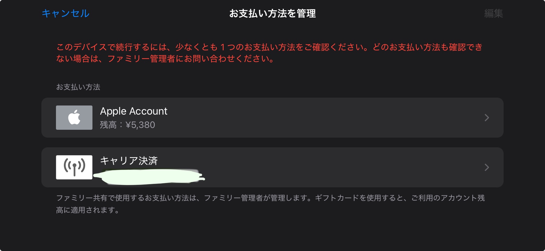 Apple Account に残高をチャージした後に、その残高を使ってゲーム内で課金をしようとすると、「お支払い情報を確認してください」という表示が出てしまいます。そのまま「確認する」を選択すると、「ファミリー管理者のキャリア決済を使うためには確認コードを入力してください」と表示されました。その画面から「戻る」を選ぶと、支払い方法を管理するためのページに飛ばされたので、支払い方法のうち「Apple Account」を選択したのですが、そこから残高を使うことができません……。ページに表示された支払い方法のうち、もう一つには「キャリア決済」と書かれていて、赤い文字で「要確認」と書かれています。Apple Account内の残高から引き落としをしたい場合でも、このキャリア決済の確認を行わなければいけないのでしょうか?キャリア決済の確認をした後に、そのまま支払いがキャリア決済で行われてしまったりしないのでしょうか……?このような状況になったことがないので、何もわからず……。有識者の方がいらっしゃいましたら教えてくださると嬉しいです。よろしくお願いします!