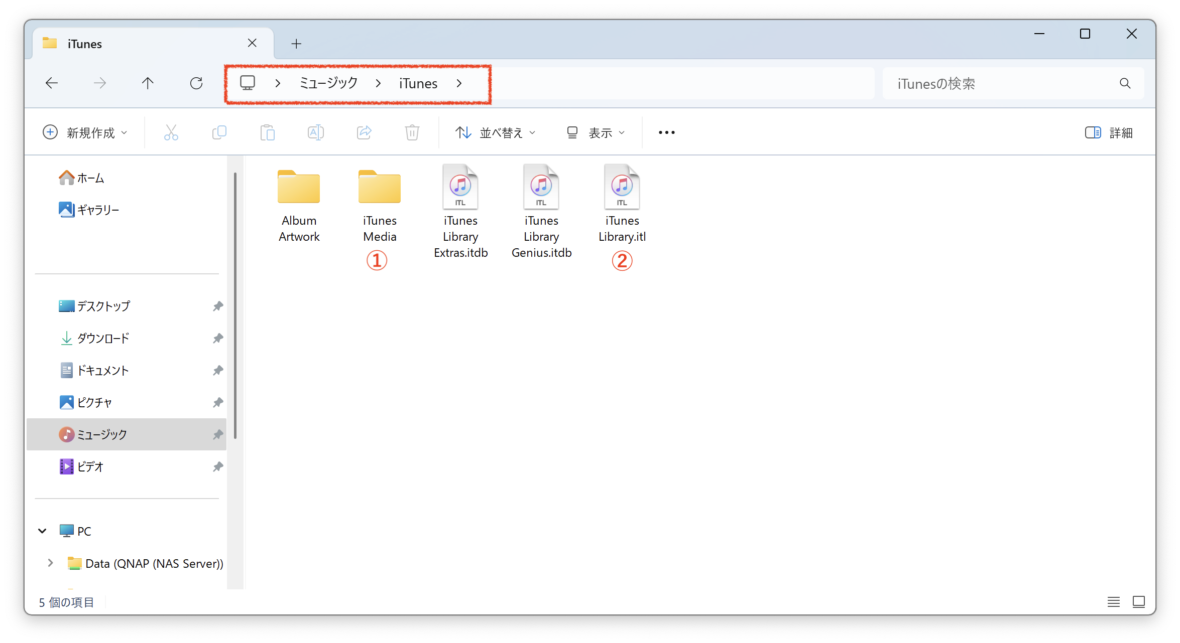 ①「 iTunes Media」フォルダの配下に音楽データが保存される。