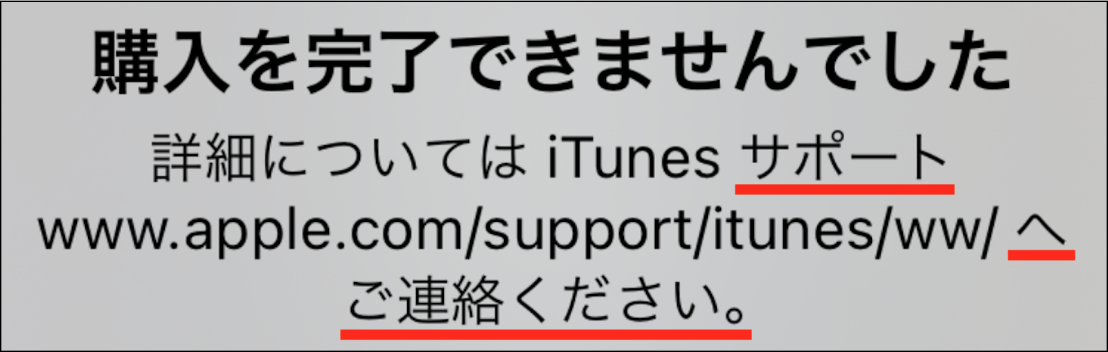 もし、下の画像の様に、エラーメッセージに「サポートへご連絡ください」と表示される場合は、Apple 側で対処する必要が有る(ユーザ側では対処出来ない)と言う事ですので、Apple サポート(受付時間 : 午前 9 時 ~ 午後 9 時)に連絡して事情を説明 して下さい。