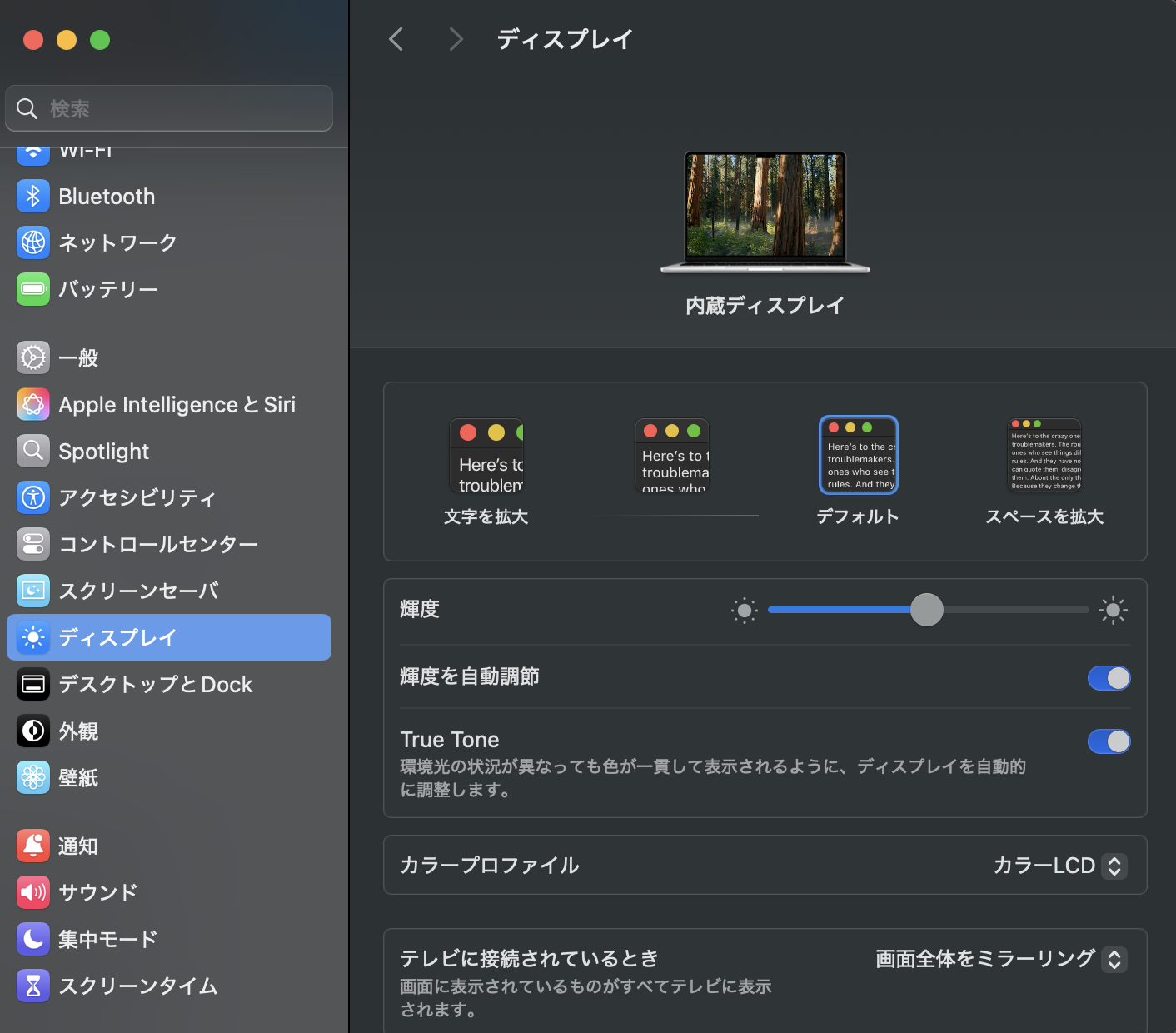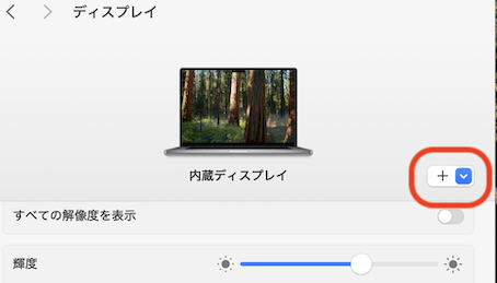 「システム設定>ディスプレイ」 の設定は添付のとおりです(プロジェクタを接続した状態)。