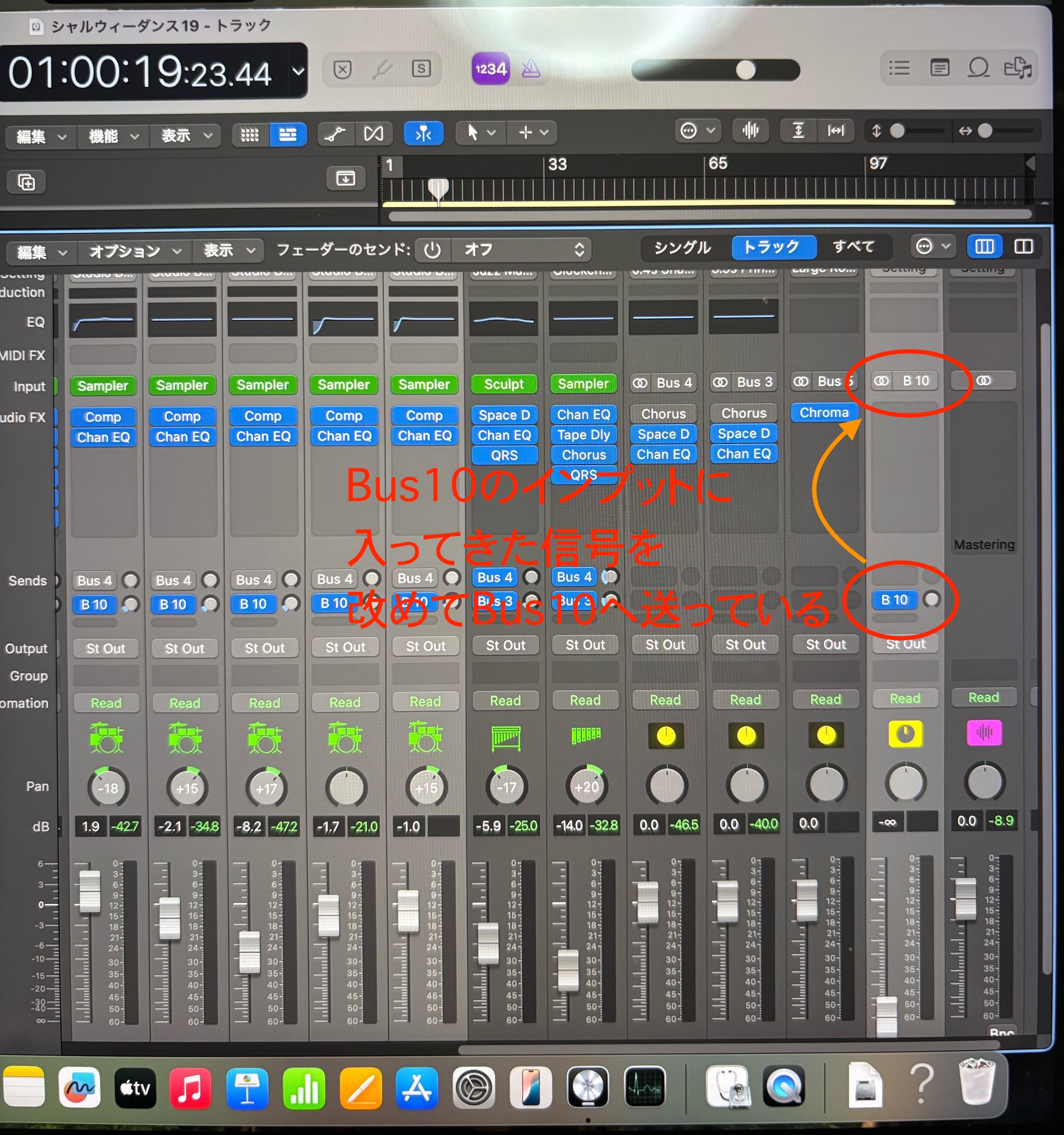 さらにそのチャンネルストリップからSendsでBUS10に送っているからその送りレベルを上げていけばループ(ハウリング)になりますけど…。