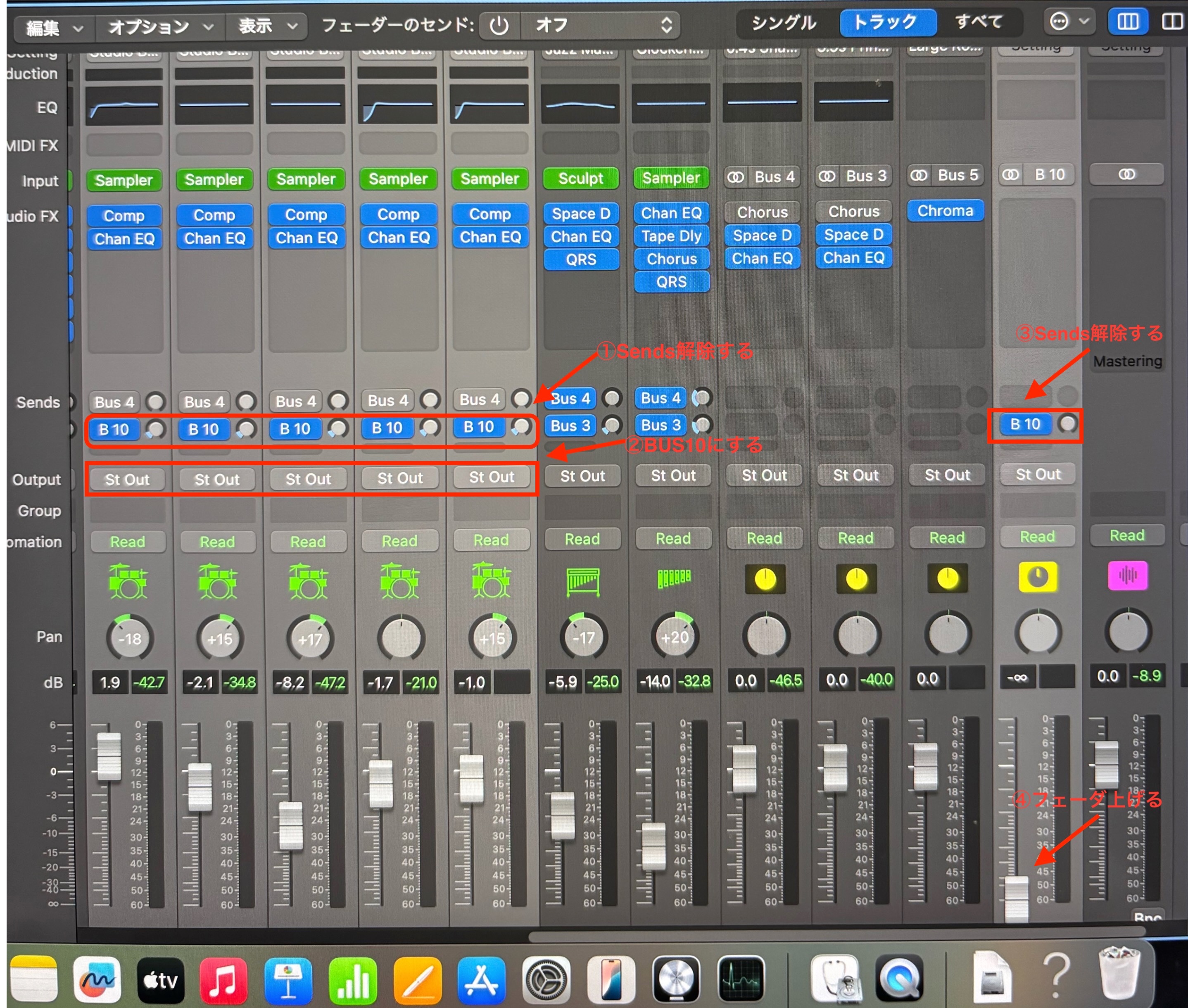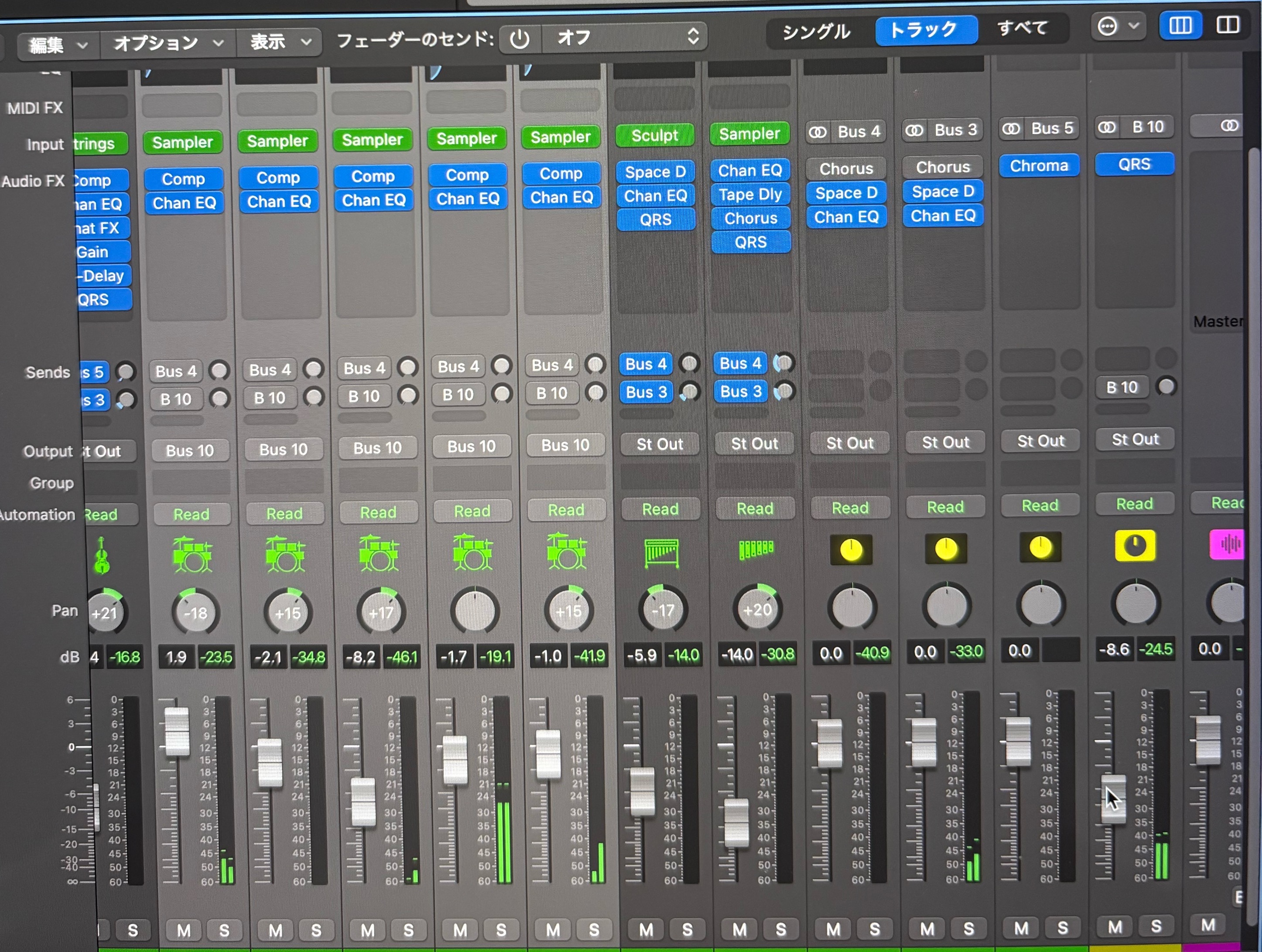 バス10を設定し、ドラム6トラックを送った後の画像になります。