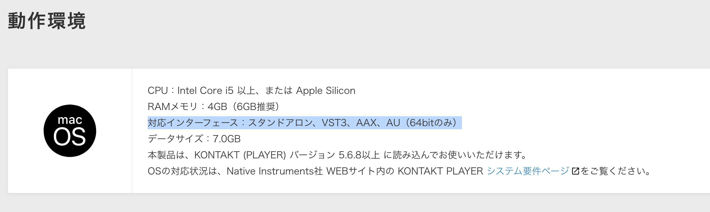 「対応インターフェース」とはスタンドアロンとそれからVST3, AAX, AU(64bitのみ)に対応している規格のようなものだと捉えてください。