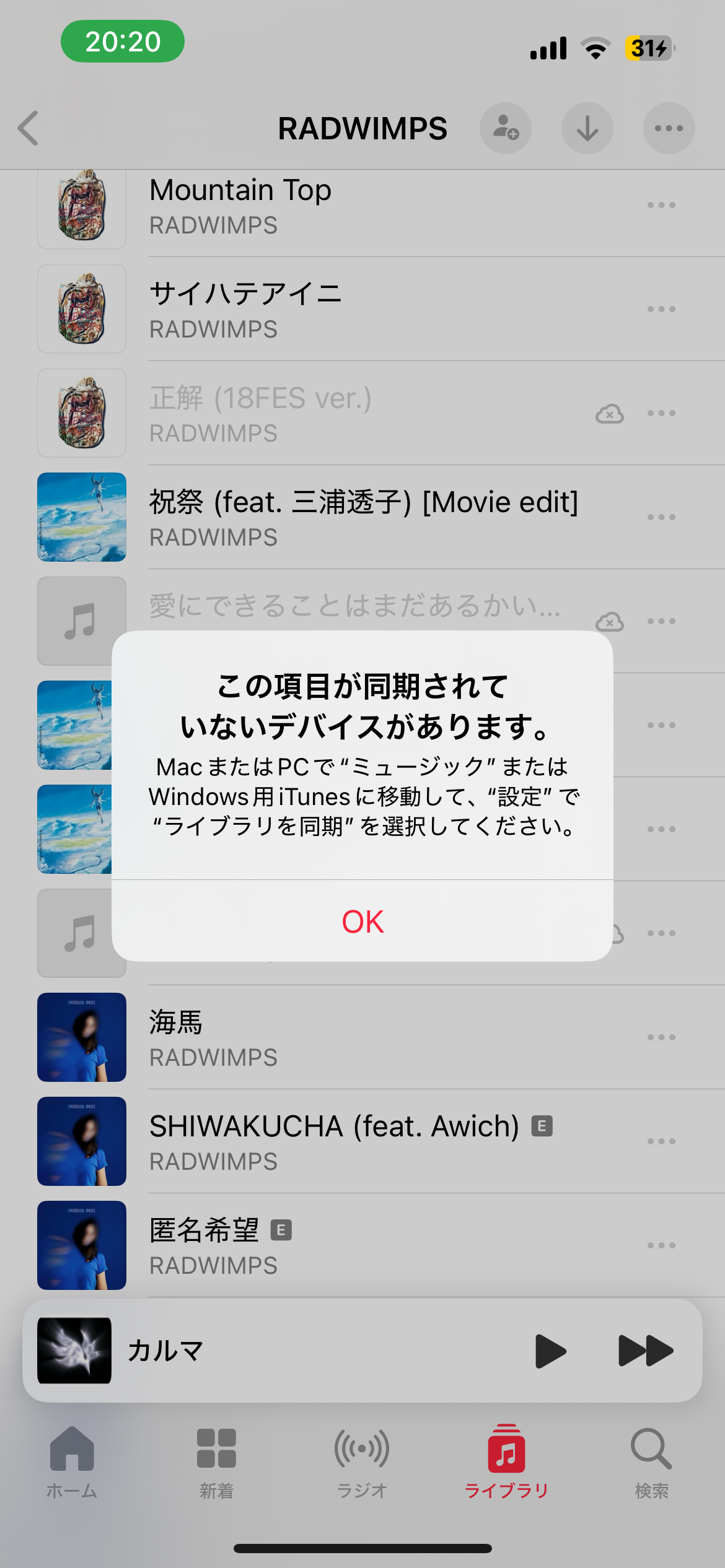 添付画像のエラーが特定のアーティストのみで発生、本体の設定から同期をオンオフ等してみるも改善されず、PCに繋いでもクラウドを使用していると表示されPC上では中身を触らない状態だった。この曲たちを聴ける状態にしたいです。