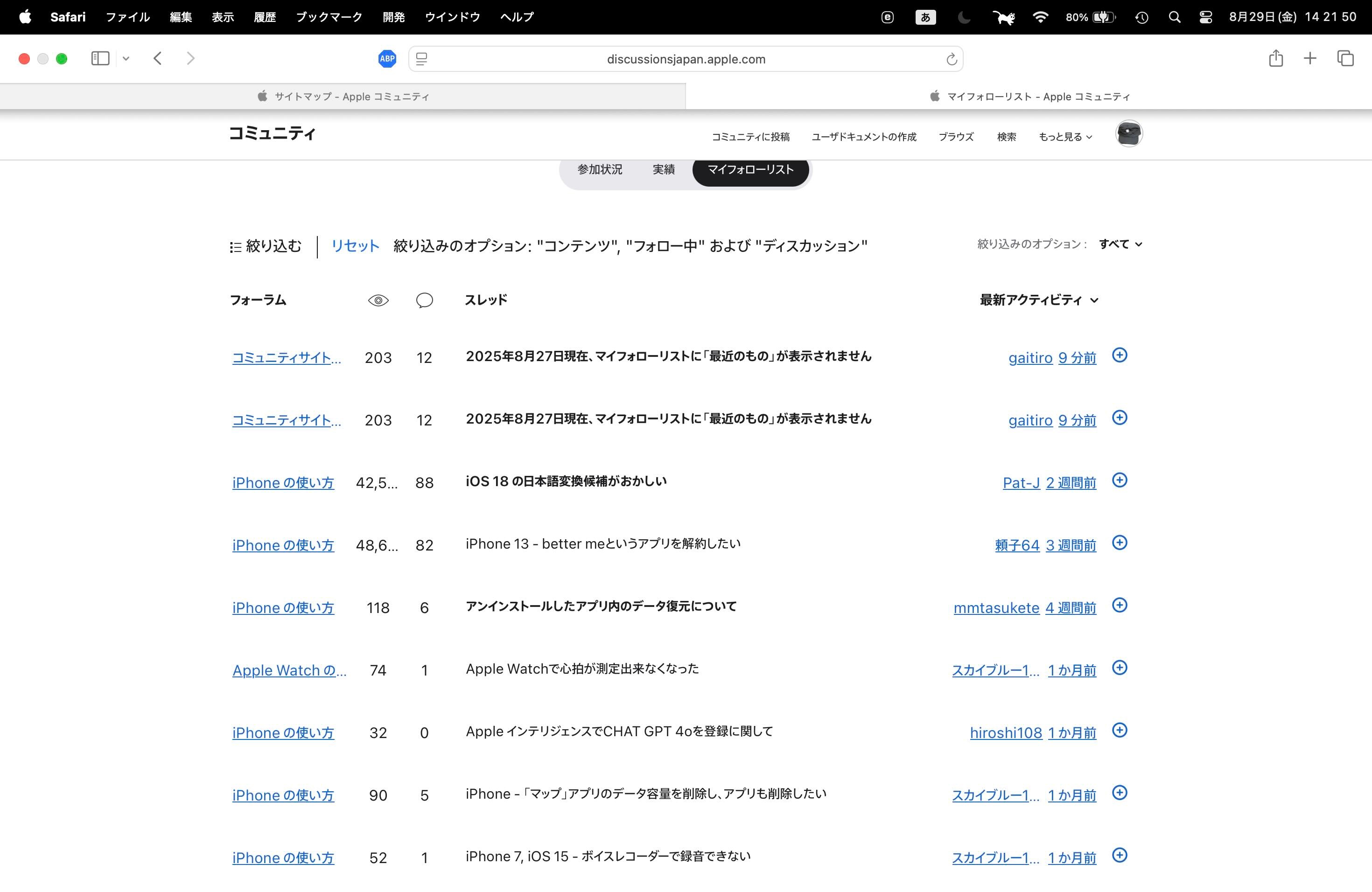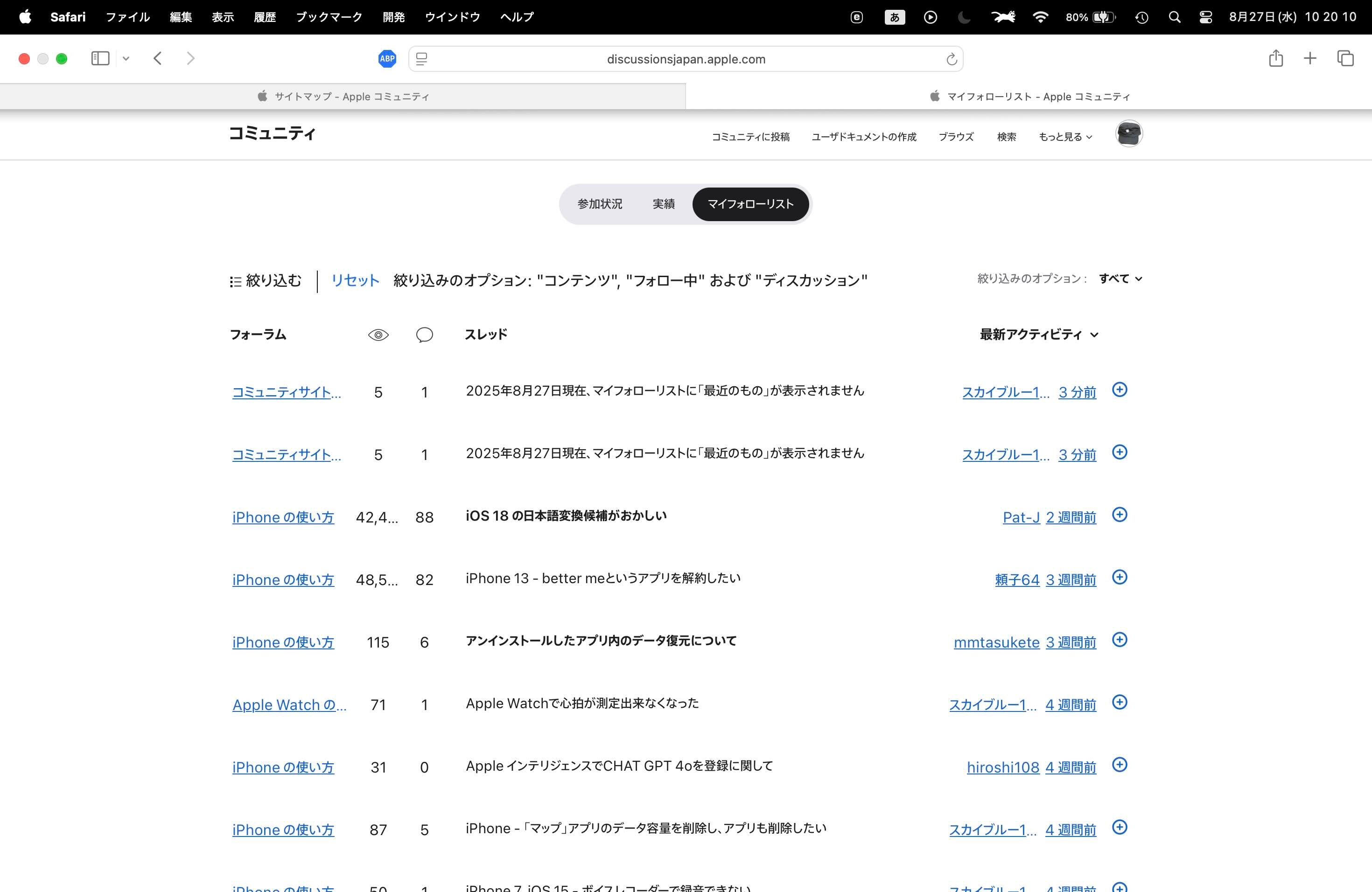 2025年8月27日現在、マイフォローリストに「最近のもの」が表示されません