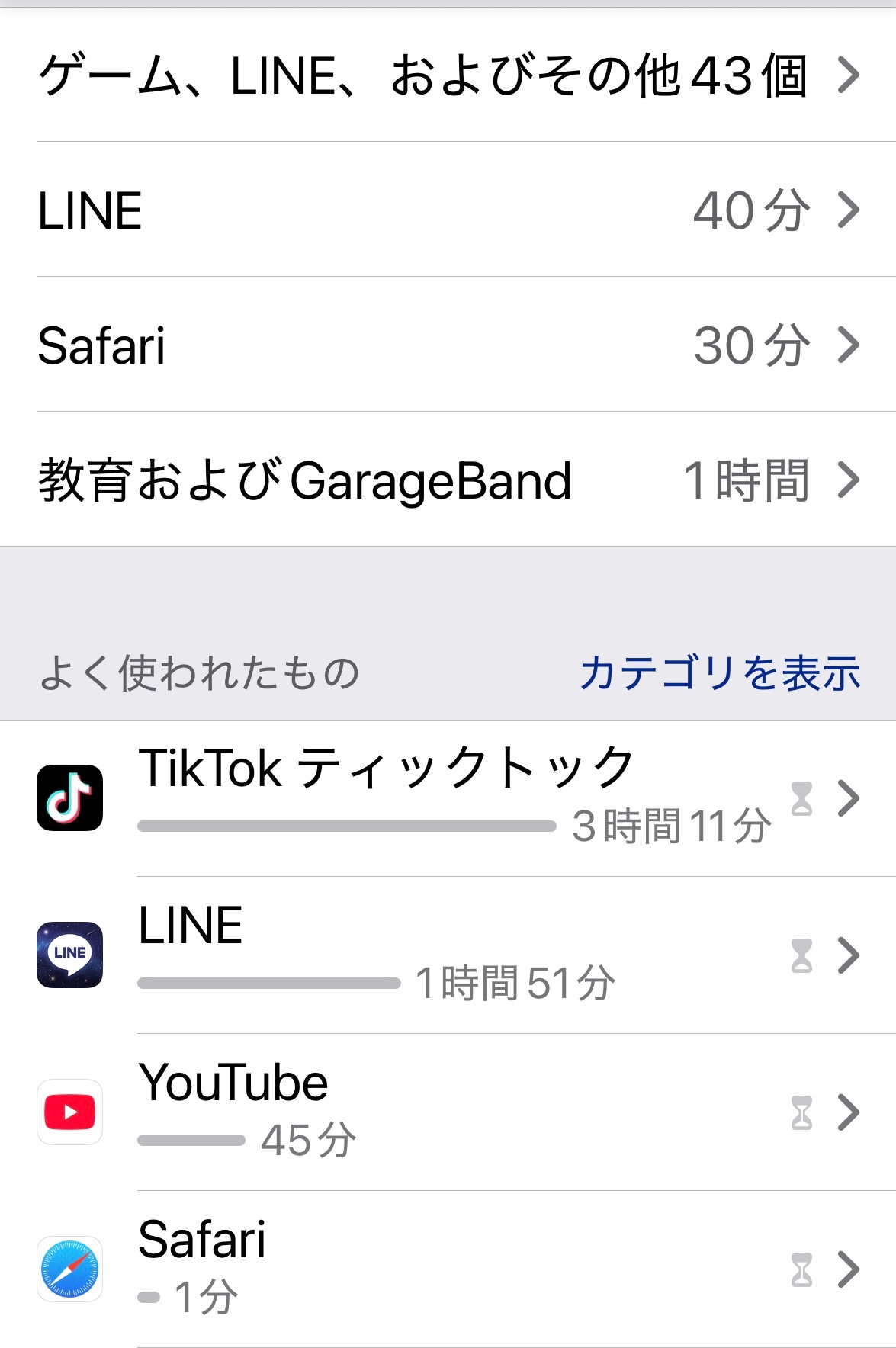 ちなみにTikTokなどのゲーム関係は1時間/1日しか使えない設定なのに、3時間超使っているように見えます。