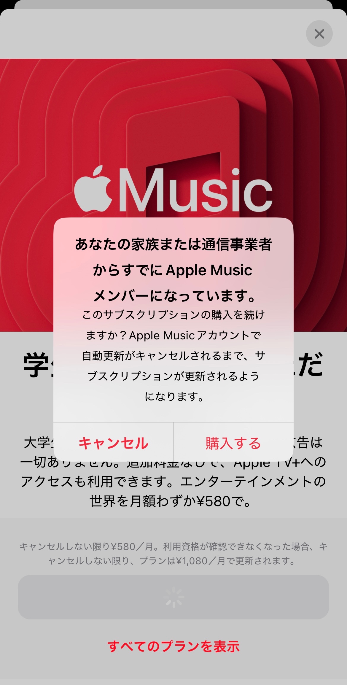 Applemusicの月額プランだったんですけど学割プランに変更できると知り変更しようと学生証を提出し、認証してもらいました。でもその後下の画像のようになってしまって購入するを何度押しても繰り返し表示されます。ファミリープランのせいだと思って解除したのですが1日経っても変わらず画像のようになってしまいます。どうしたらいいでしょうか。