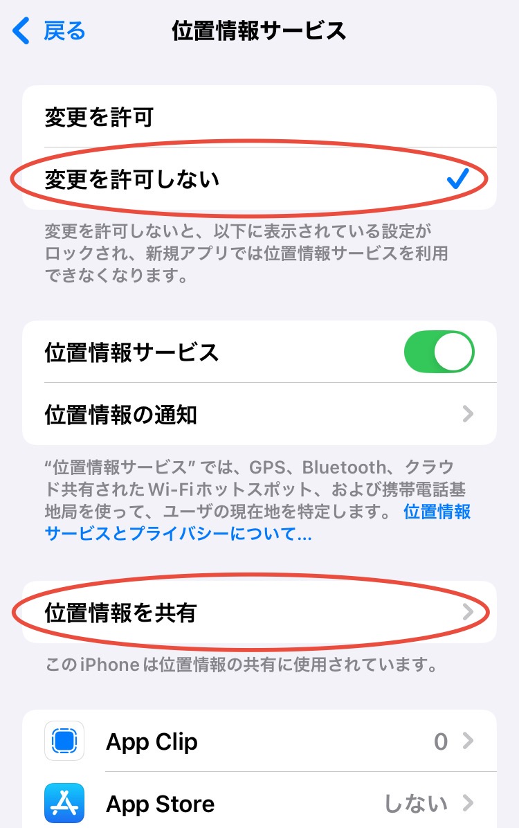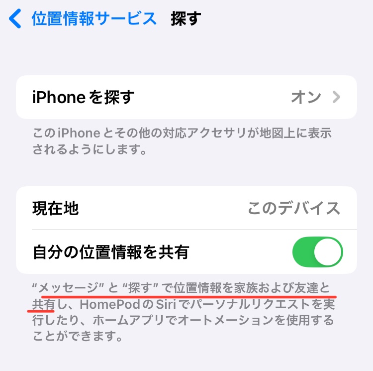 現在、私と子供をファミリーを組んでおり、「スクリーンタイム」→「コンテンツとプライバシーの制限」→「自分の位置情報を共有→共有しない」に設定しています。しかし子供が使用しているiPhone15の「設定」→「プレイバシーとセキュリティ」→「位置情報サービス」→「位置情報サービス→OFF」にすると、私側の「探す」で位置情報が出てきません。