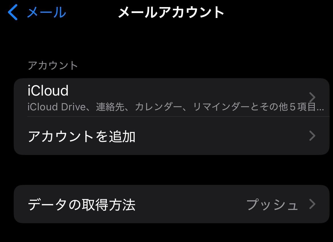 設定アプリ>アプリ>メール>メールアカウント、でiCloudの項目がオンになっていますか?