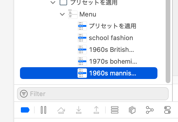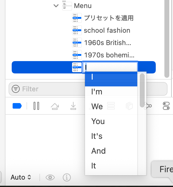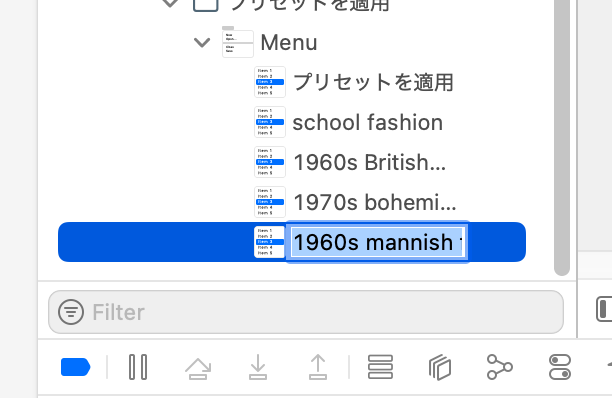 今回の場合はビュー内に配置したポップアップメニューのうち、左ペインに表示される項目名の変更を試みました。そこでおかしな挙動を発見したので、これは仕様かバグ挙動かを判断していただきたく投稿しました。あくまでこのペイン内での内容(表示される文字列)がどうこうという話で、実際のポップアップメニューの内容がここを変更しても変わらないことは理解しています。一応、念のため。