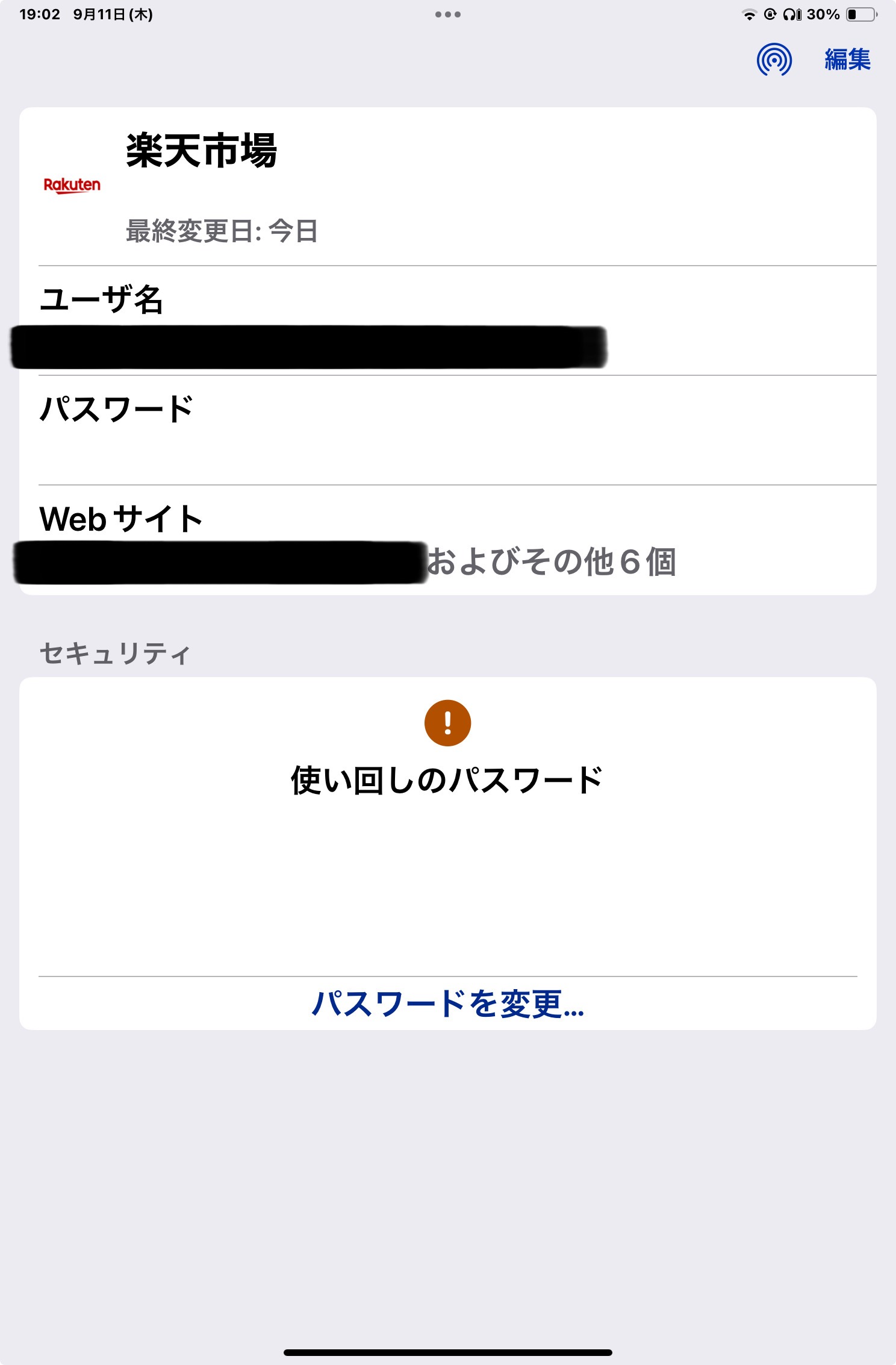 iCloudパスワードキーチェーンを開くと、正常なら登録したサイトの一覧が表示されると思います。しかし現在私のiPad mini (A17 pro) (iPadOS 18.6.2)では、いきなり添付画像の画面が表示され、一覧に戻れません。しかも画像画面の中でも、右上の共有と編集はできるのですが、下部の「パスワードを変更」はタップしても反応しない状況です。