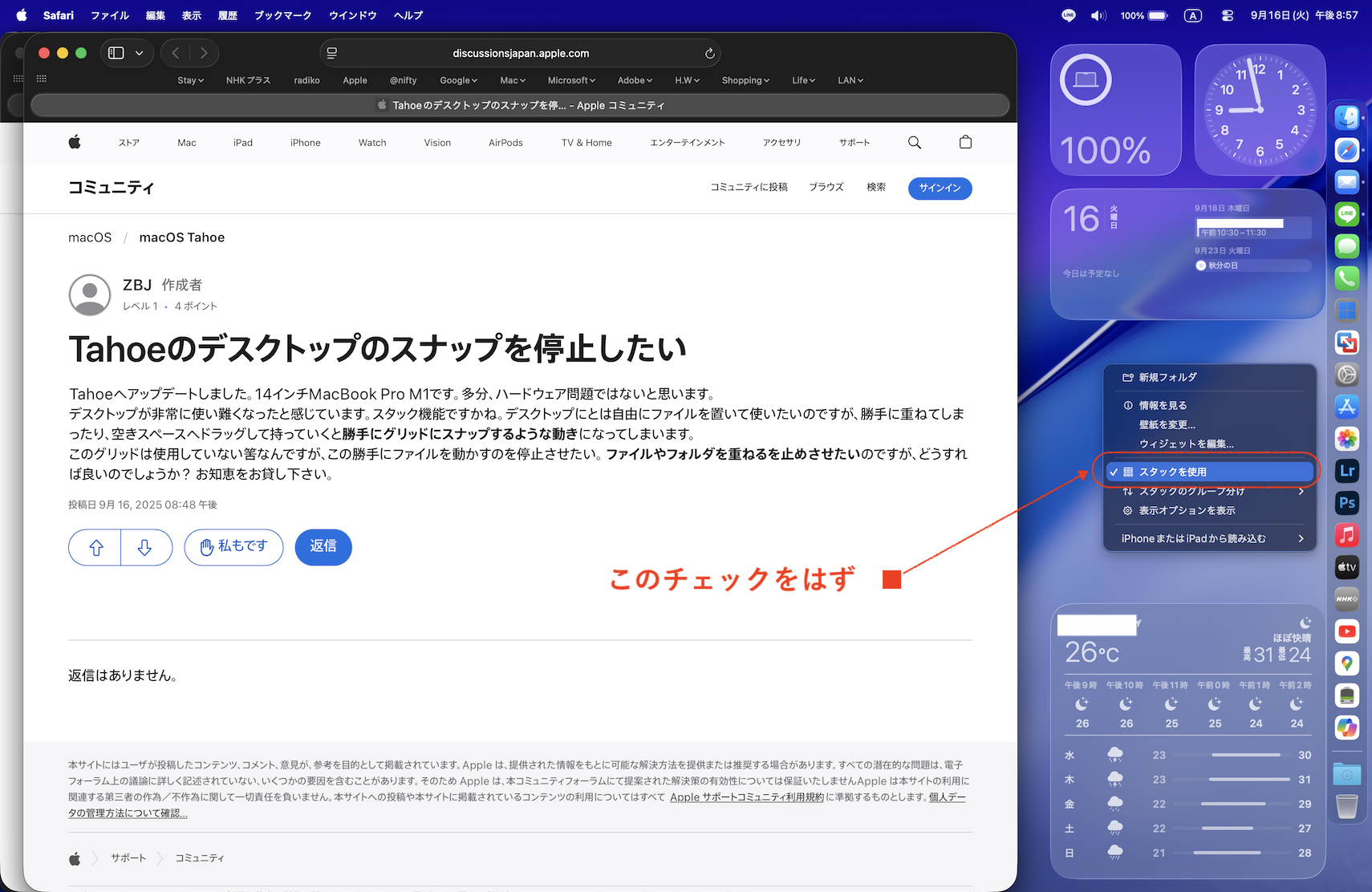 MacBook Pro M1 - macOS Tahoeのデスクトップのスナップを停止したい