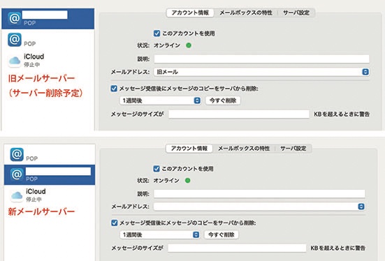 メールサーバーが新旧と2つあり、旧メールサーバーを削除したいのですが、旧サーバーのメールやフラグをそのまま新サーバーの方に引き継ぎたいです。方法を教えてください。以前、旧メールサーバーのアカウントの「このアカウントを使用する」のチェックを外すとメールが消えてしまったので現在、両方ともオンラインの状態で使用しています。(※新サーバーの方にメール情報が全て引き継ぎ次第、削除予定です)よろしくお願いします。