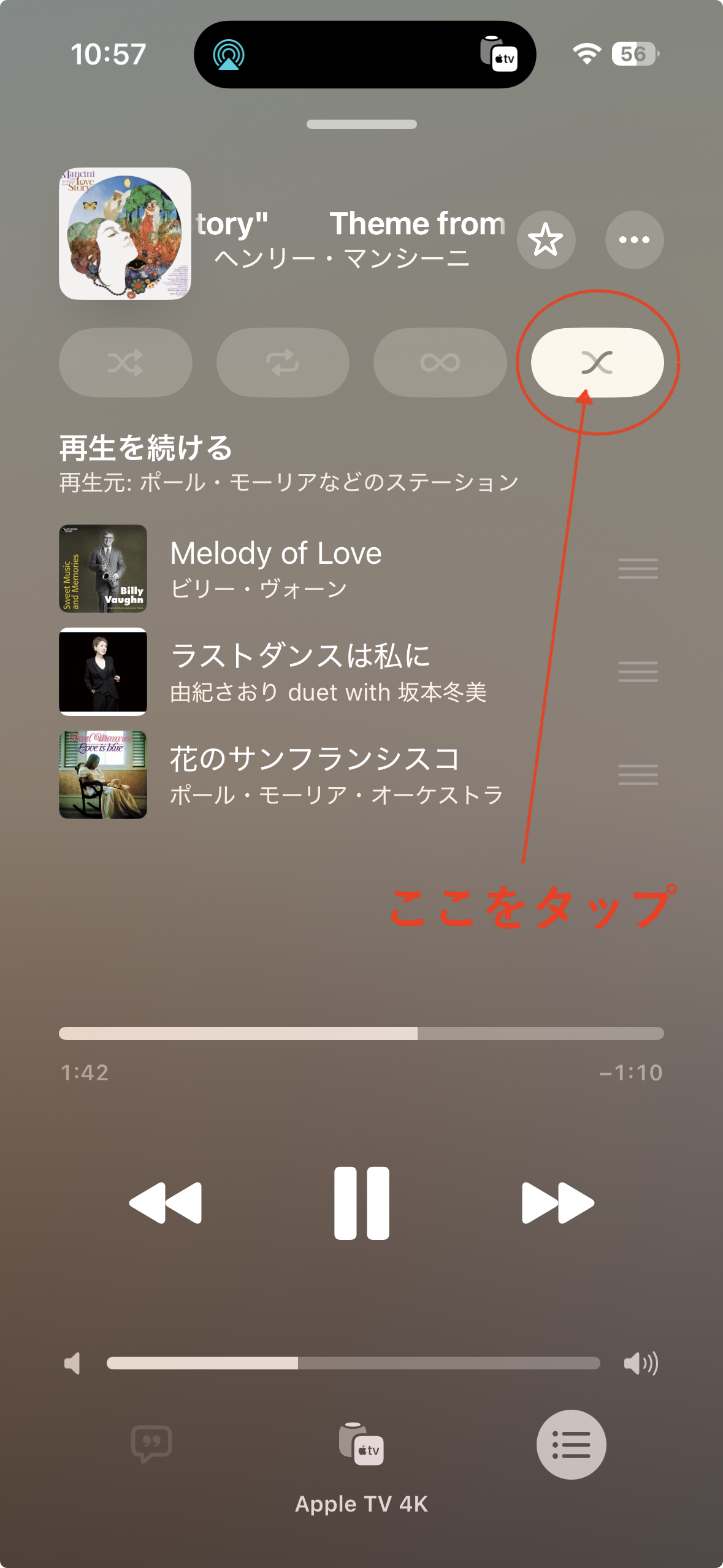 iPhoneでミュージックアプリを開き、プレイリストを再生してみましたが、クロスフェード再生にならず、通常の再生のままでした。