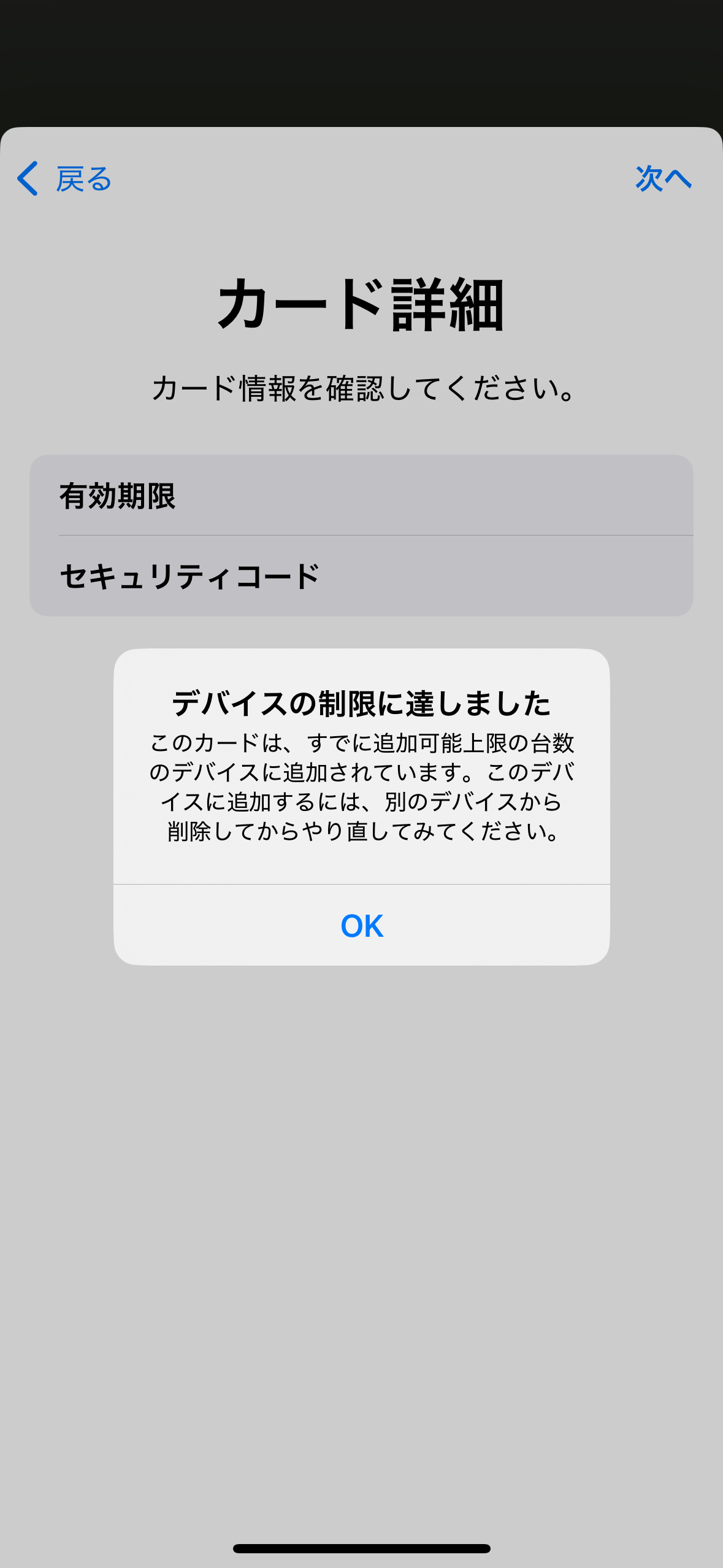 『デバイスの制限に達しました。このカードはすでに追加可能上限の台数のデバイスに追加されています』と表示されます。