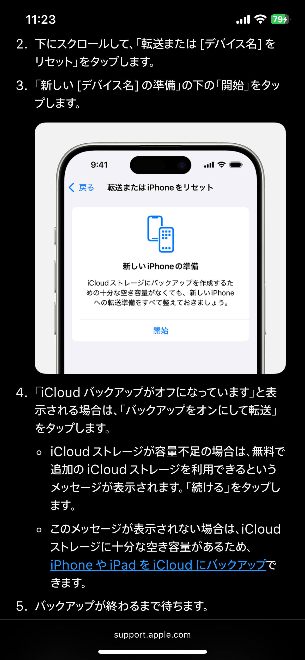 iCloudの容量がいっぱいでバックアップが取れないと表示が出るため、転送またはiPhoneをリセットから一時的にバックアップを取ろうとしていますが、