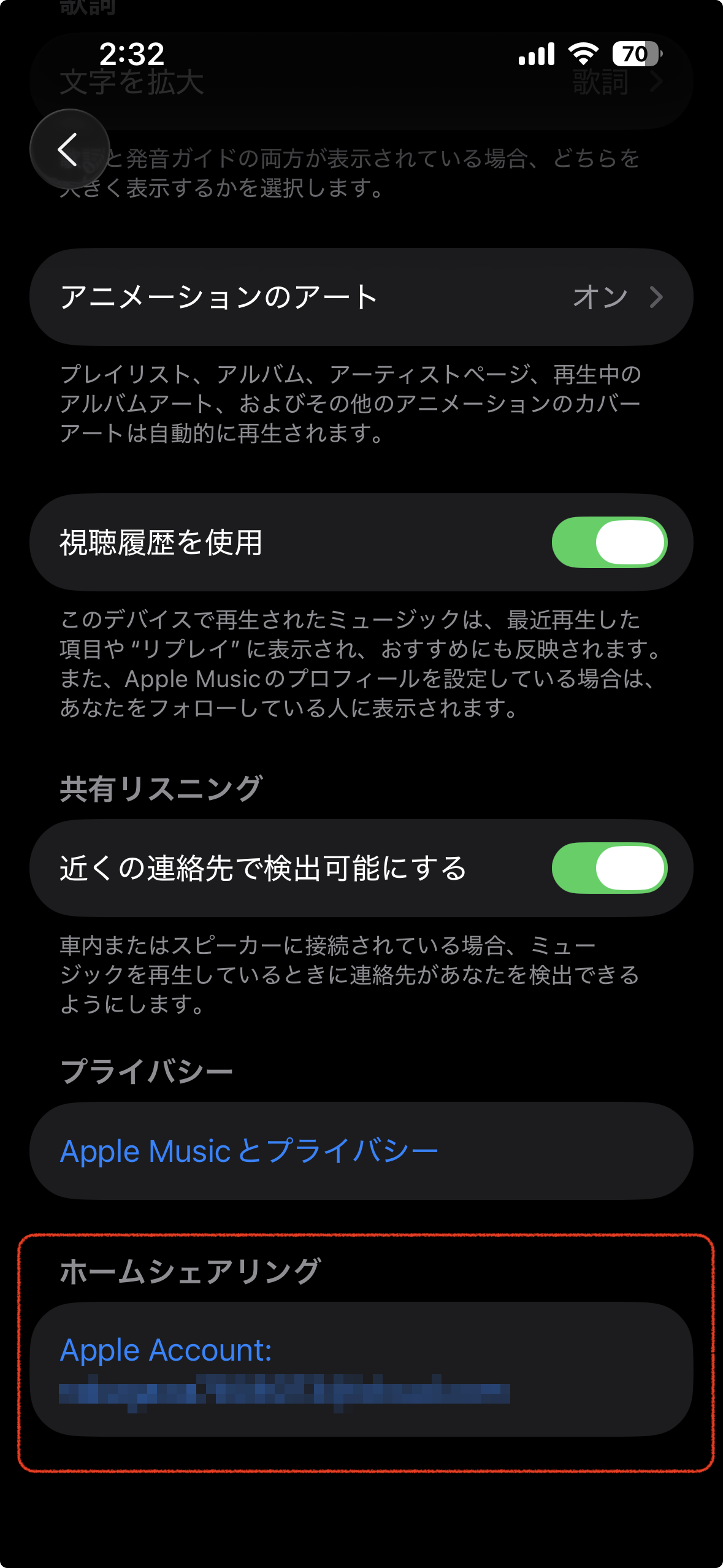 iPhone X - 「ミュージック」Appでホームシェアリングのスイッチが表示されない