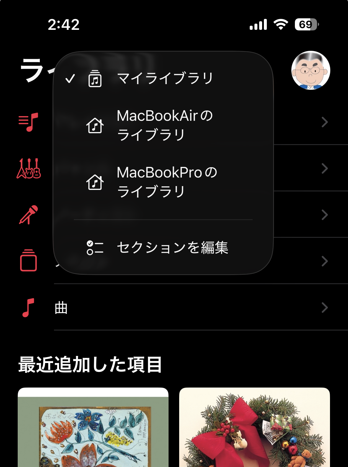 さらに、別のiPhoneではライブラリ名「My-Music-on-NASsolger70」が表示されて再生できるものもありますが、もう一台では再生できない・スイッチが無いなど、挙動が異なります。