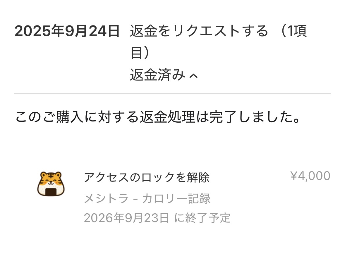 ちなみに、返金リクエストが承認されて返金済みと記載が出たのは9/24 21:00頃です。