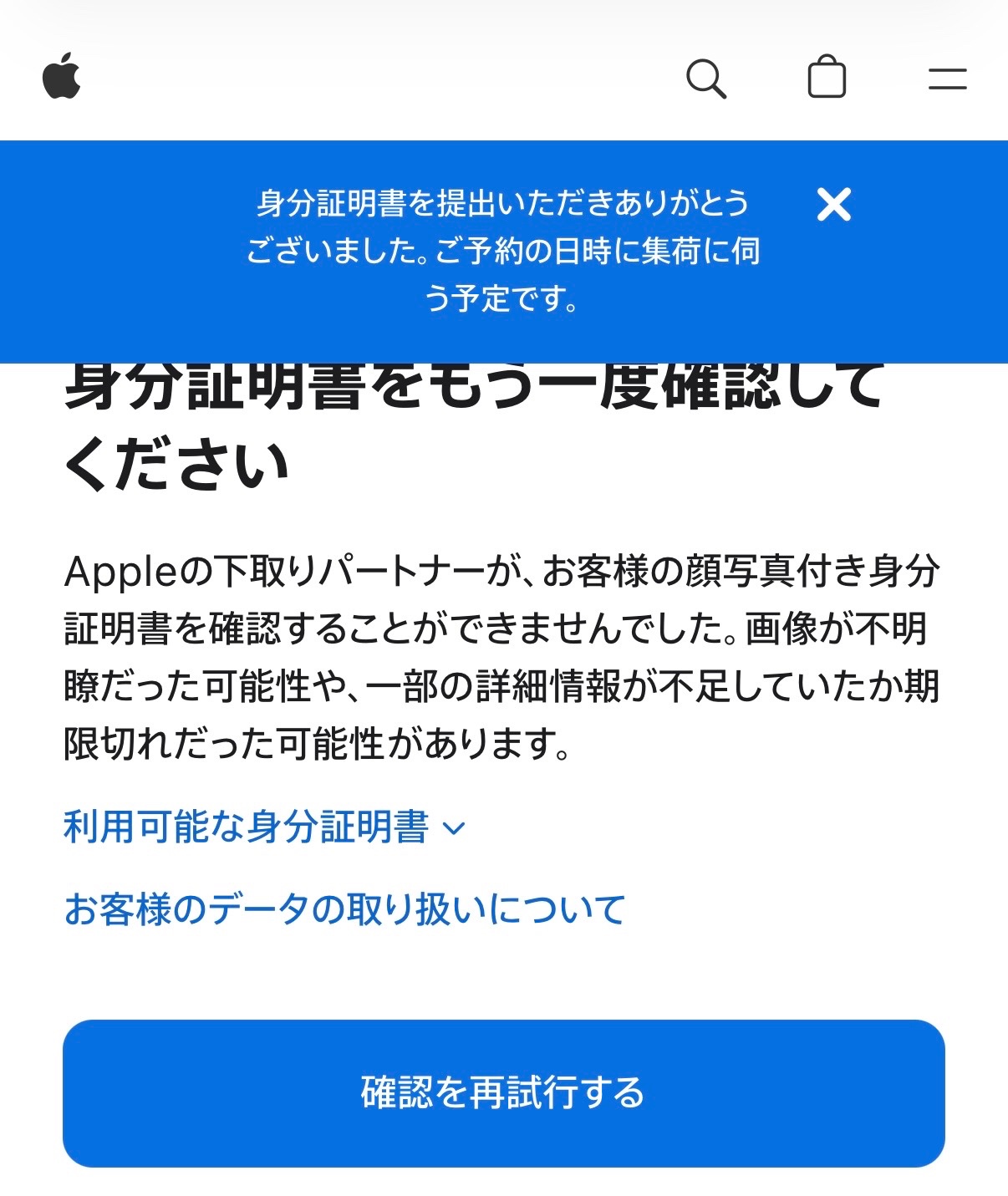 iPhone買い換えに伴う下取り手続きをしたところ、「下取りを進めるにあたり、お客様の身分証明書を再度確認していただく必要があります」というメールが届いたので、URLを開くと、下取り手続きが完了している旨のポップアップ表示が出ます。