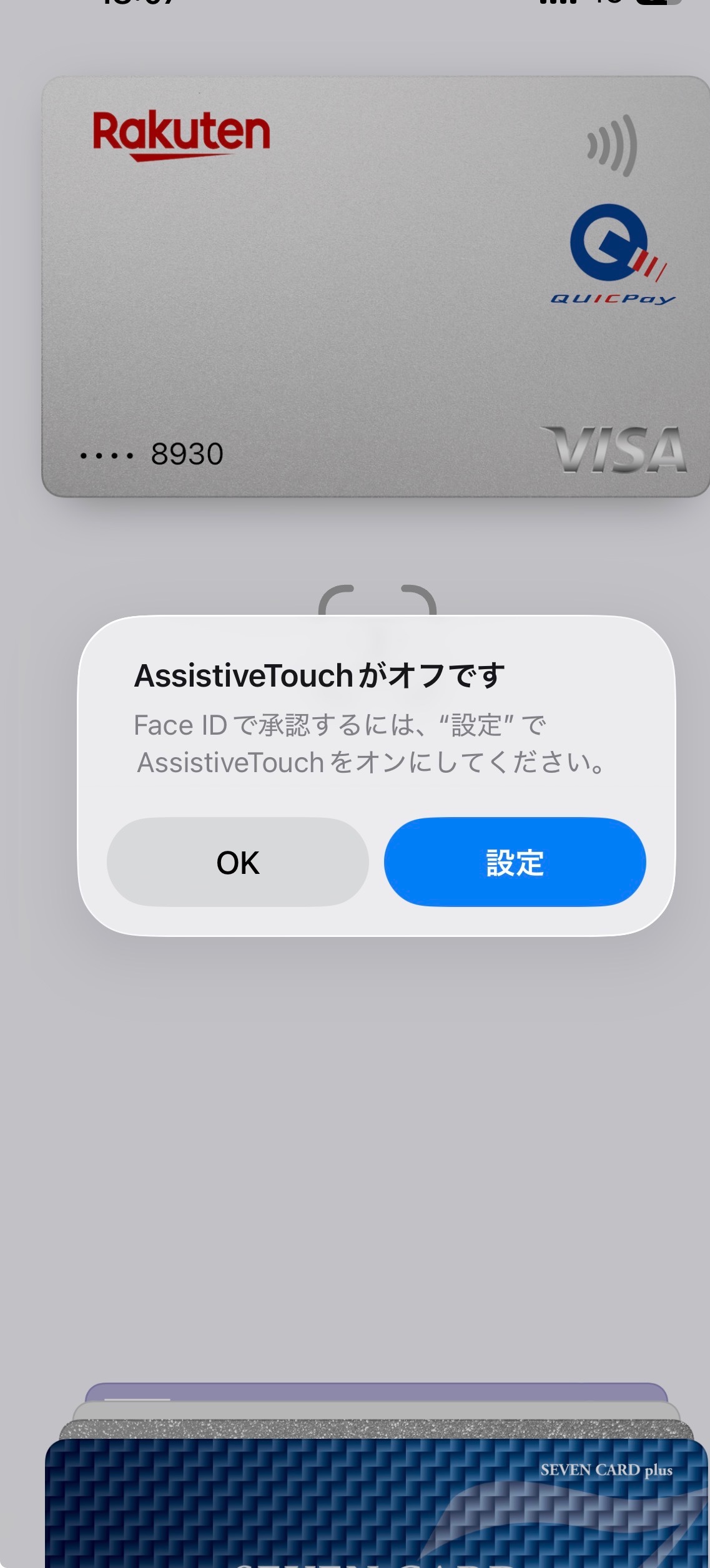 これまでは問題なく突然サイドボタンをダブルクリックでウォレットを使用できていた(フェイスIDが作動していた)が突然この画面が出た