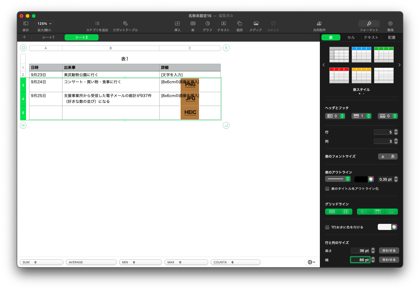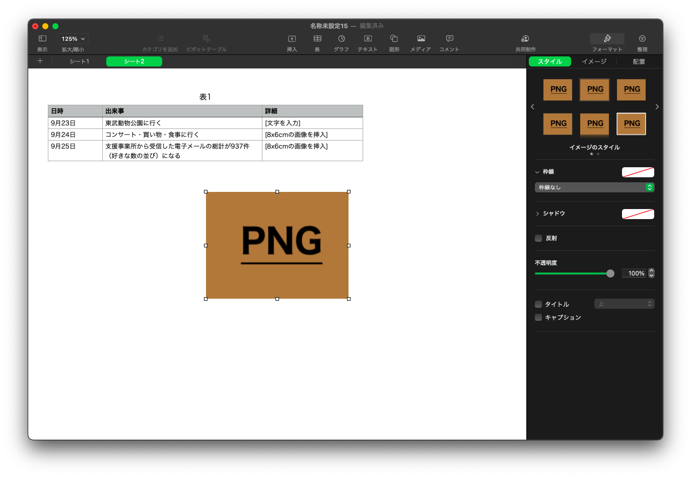 なお、 Pages で文書に画像を挿入すると、画像のファイル形式( PNG ファイルは常に文書中央に配置、 JPG / HEIC はユーザーがカーソルを置いている部分に配置)によって配置が異なることを発見しましたが、 Numbers でもこういった挙動はあるのでしょうか。