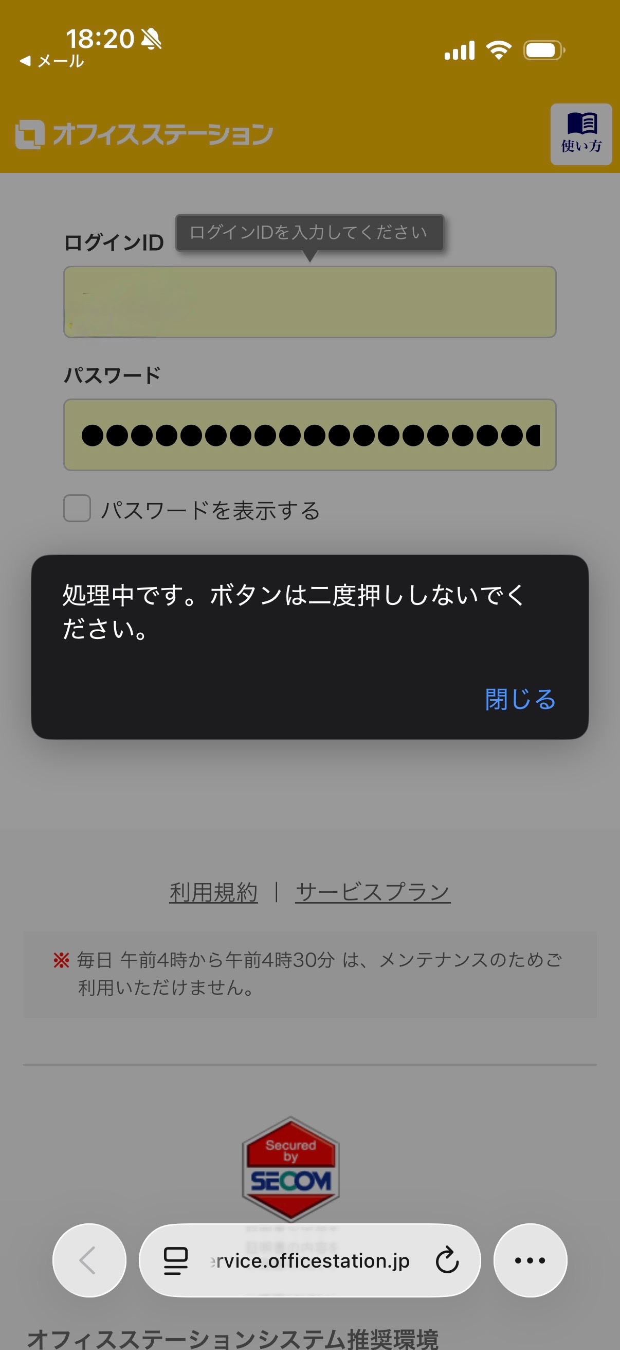 このサイトは、ログインボタンを含む、何らかの実行ボタンをを二度押すと、上記のようなエラーメッセージが表示されて、サイト表示を止める仕様のサイトなのですが、URLから当サイトに飛び、ログイン画面で、FACE IDを使いパスワード入力してログインしようとすると、なぜかログインボタンを2回以上押したことになります。