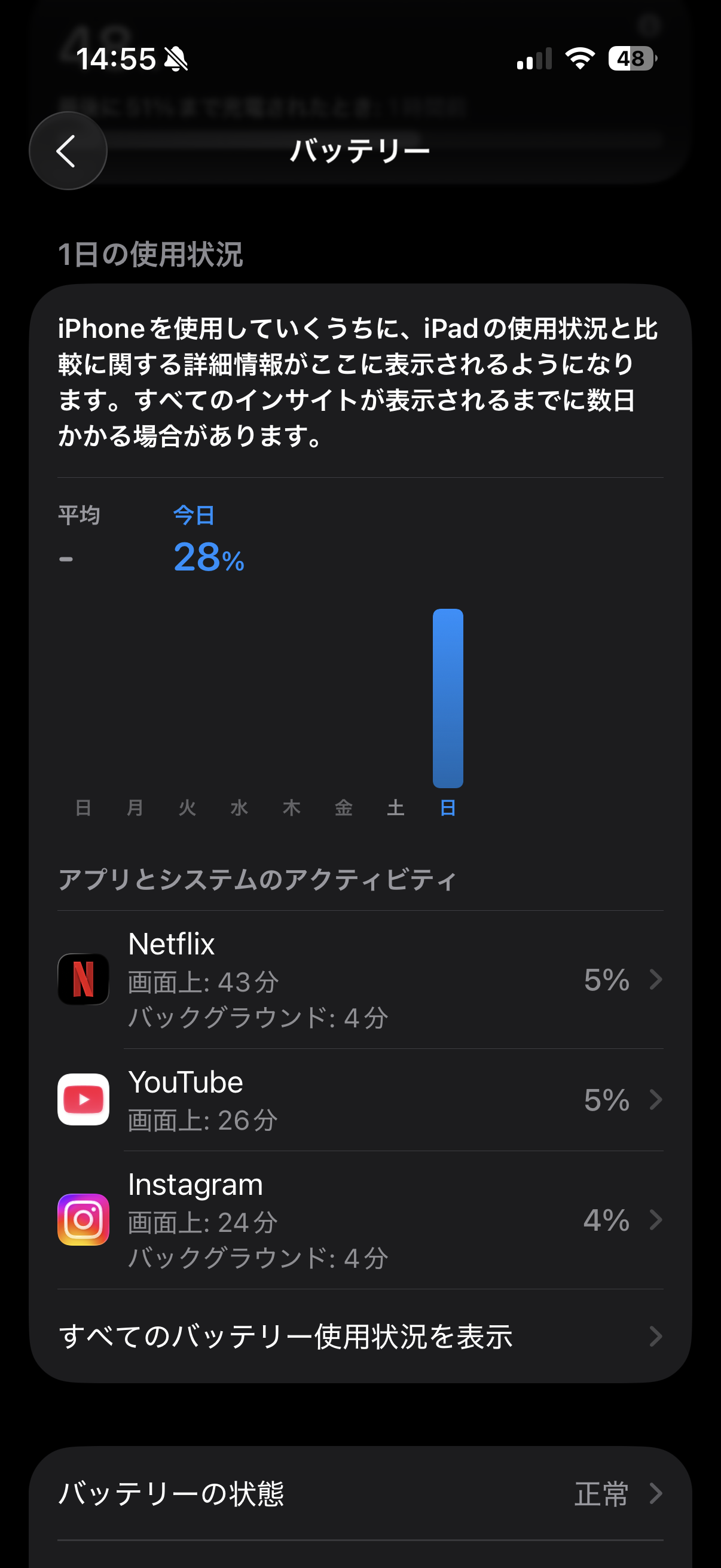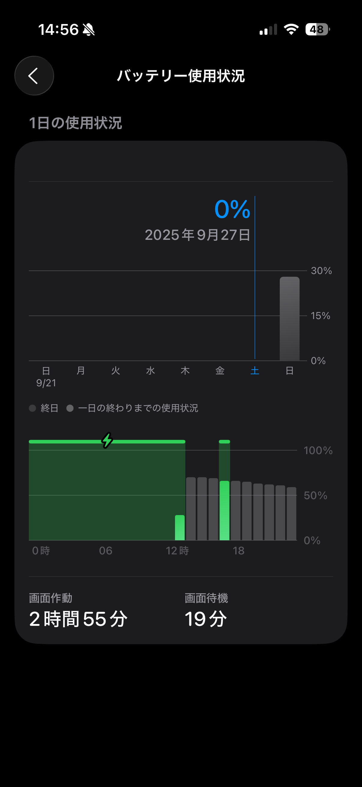 iPhone 17 Pro - バッテリーの「1日の使用状況」で過去の履歴が表示されなくなった