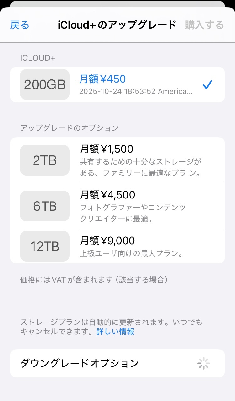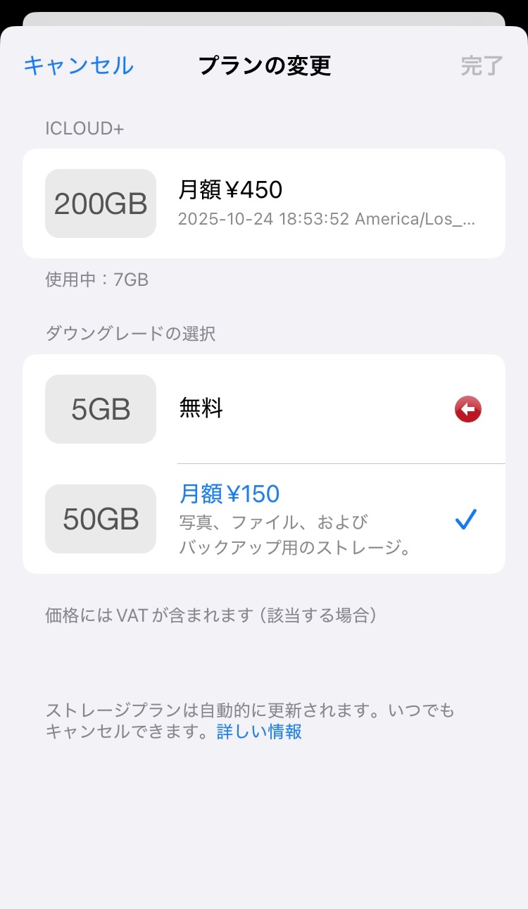 iCloudを、現在7GB程しか使っていないので200から50にダウングレードしたいです。