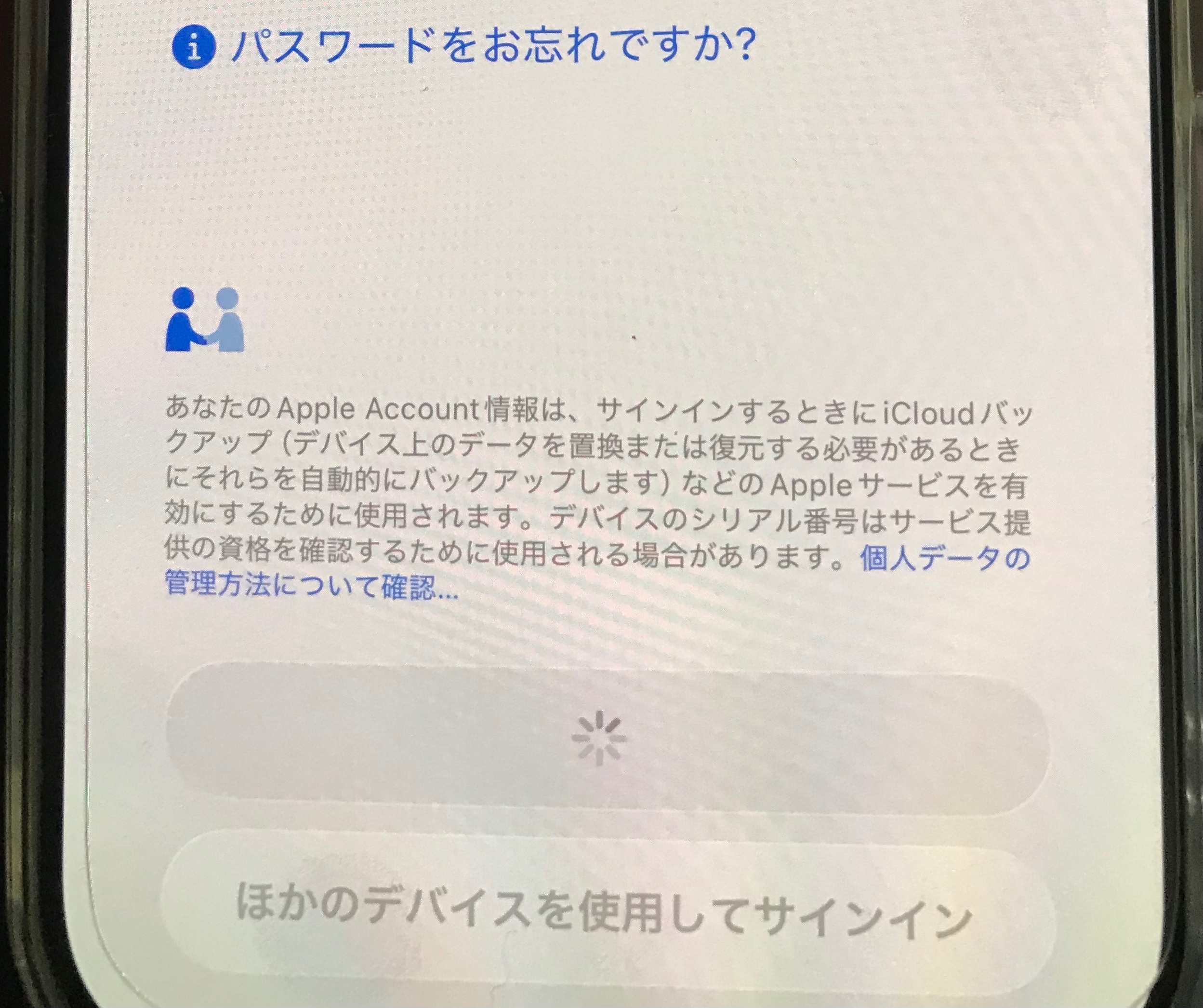 iCloudでの引き続きを試そうとしたところ、恐らく合っている電話番号・パスワードの入力後、画像のようにぐるぐるの状態が10分以上続いています。