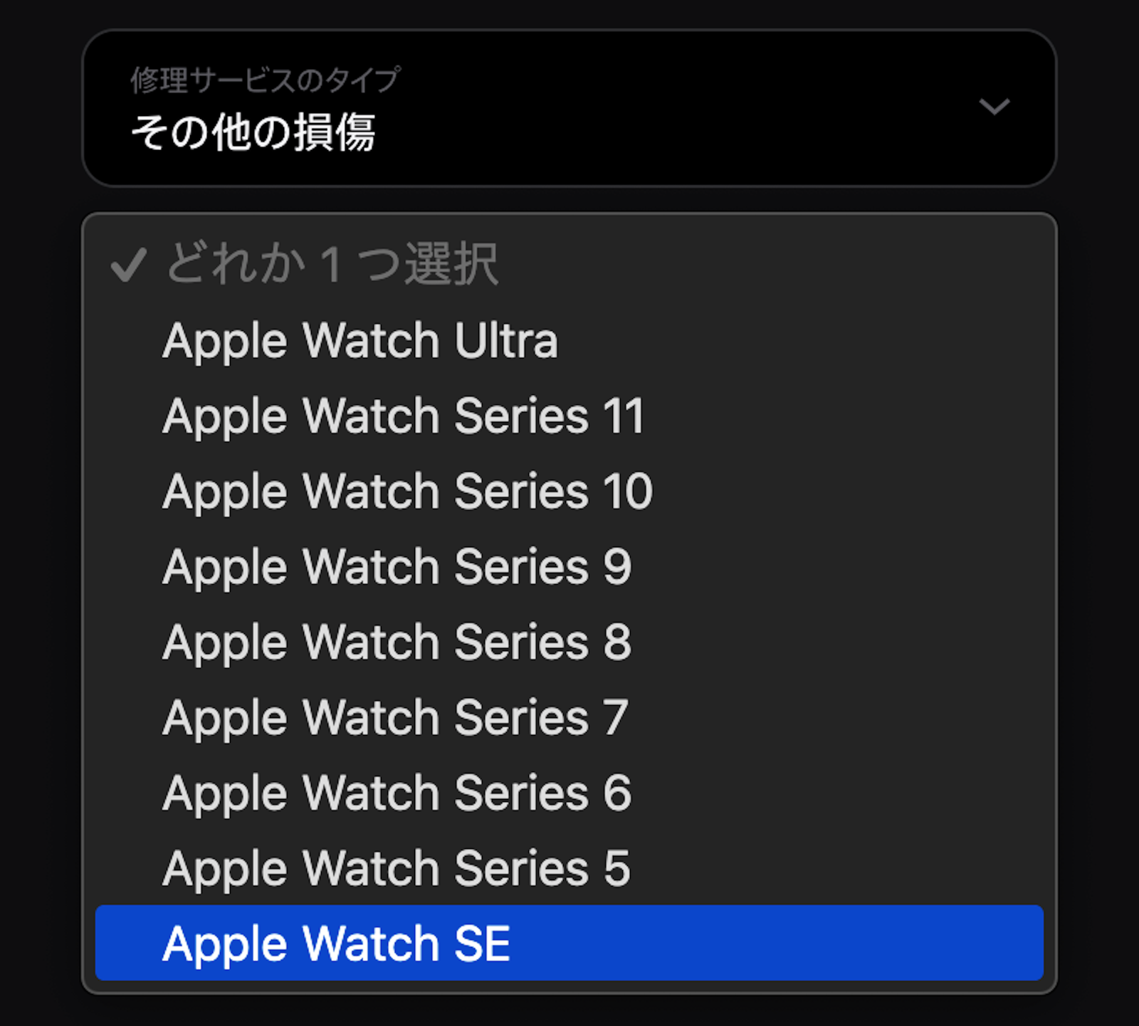 残念ながら、Apple Watch Series 3 は、ビンテージ製品(Apple が販売店への供給を停止した日から 5 年以上 7 年未満の製品)として登録されており、下の画像の様に修理サービスの選択肢にも表示されませんので、少なくとも Apple での修理は行えない可能性が高い と思います。