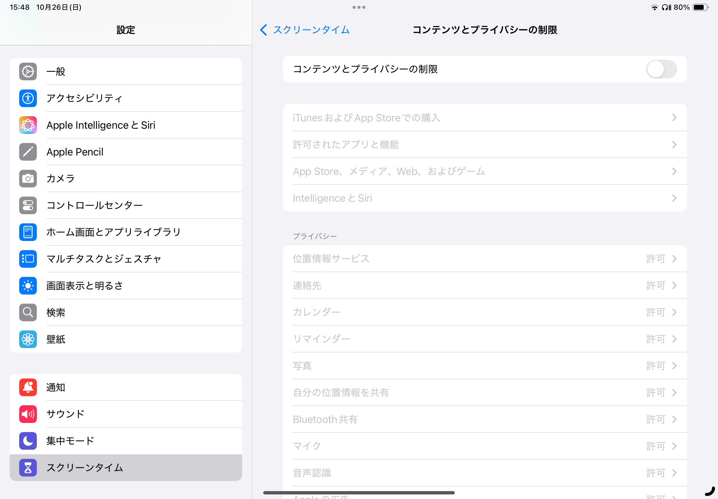 - スクリーンタイムの「コンテンツとプライバシーの制限」は設定していない