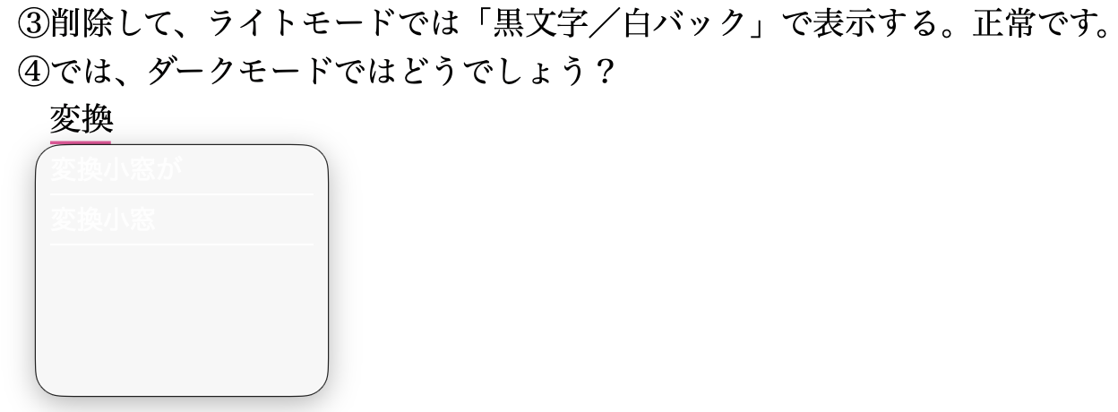 MacBook Air 13″, macOS 26.0.1 - ダークモードでIMEの変換候補の窓が「白文字・白バック」で使い物にならない