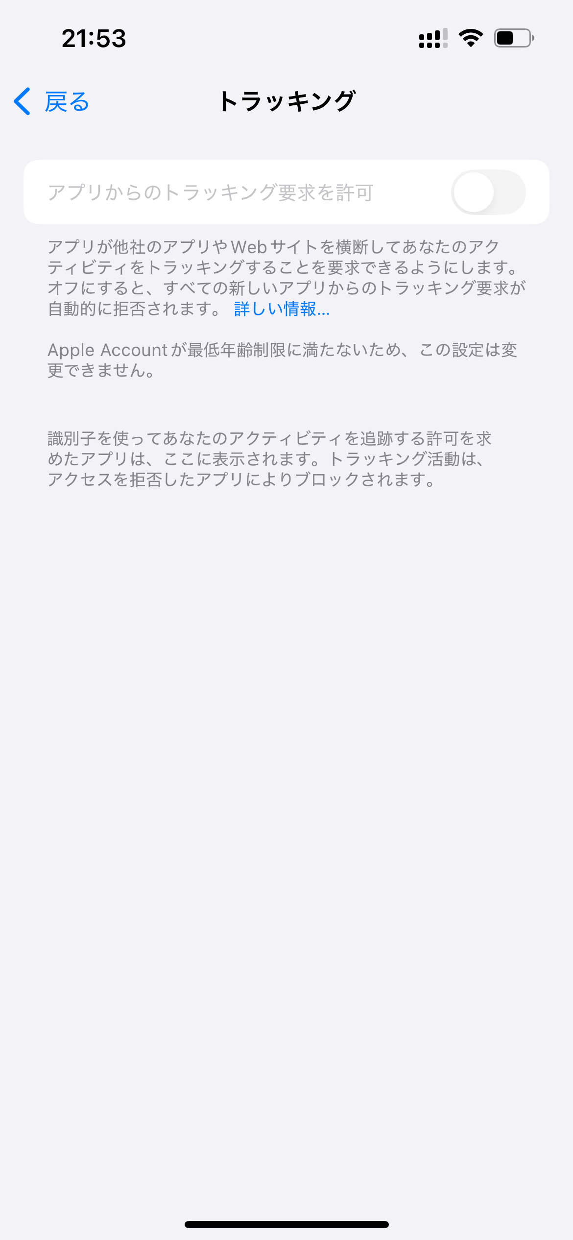 Appleアカウントの年齢は18歳以上ですし、学校に管理されているアカウントなどでもないのですが、トラッキングの許可ができません。サインアウトなども試してみましたが、無理でした。