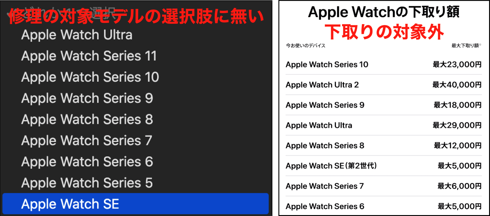 残念ながら、下の画像の様に、Apple Watch Series 3 は、既に Apple での修理対象モデルから外れています し、Apple での下取りの対象モデルからも外れています ので、何の修理か分かりませんが、非正規店で修理 して貰うか、「故障した Apple Watch Series 3 買取り」等で検索し、Apple 以外で買取って貰う しか無いかと思います。