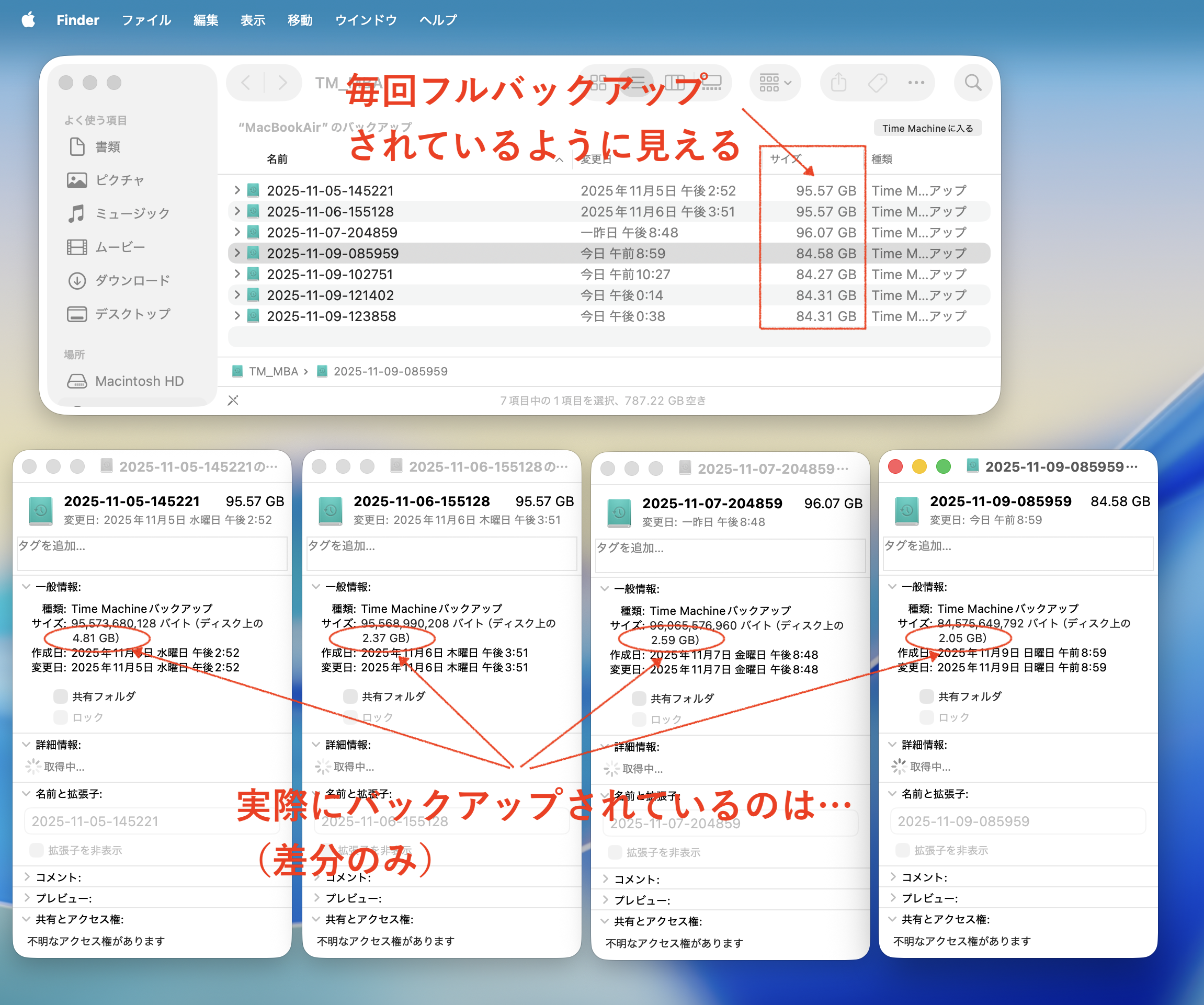 MacのHDは1GB、TimeMachine HDは2TB。TimeMachine HDを見ると毎回およそ800GBのファイルが作成されています。