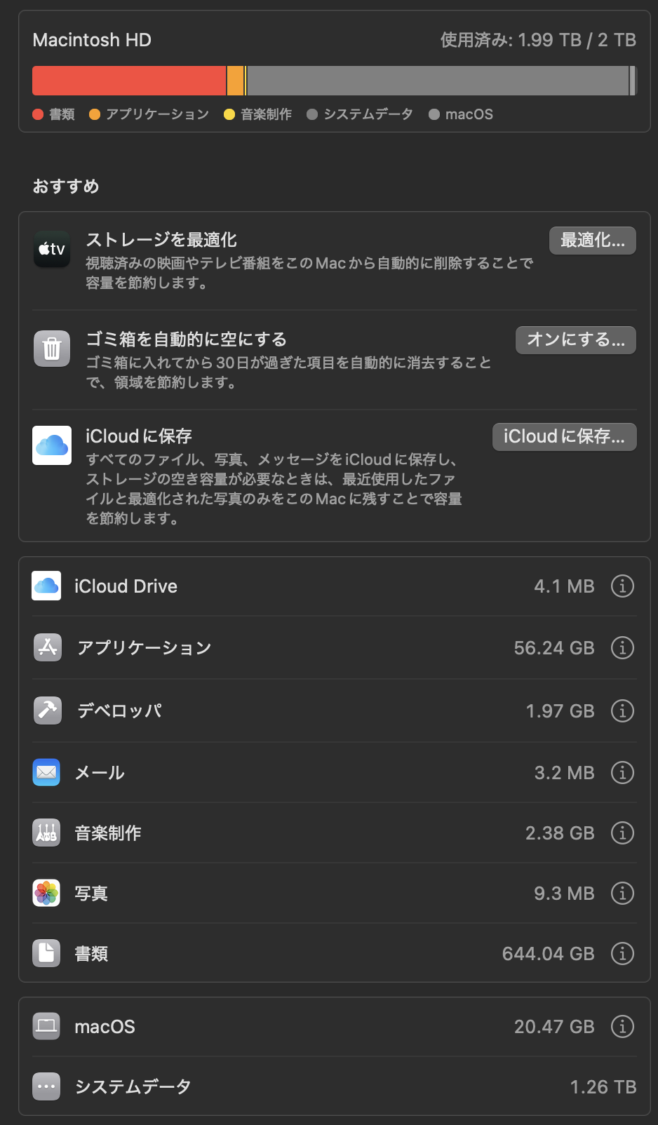 macOS自体は20.47 GBと問題ないように思えるのですが、システムデータが約1.3 TBと異常に圧迫しており、2 TBの容量ですら圧迫しています。