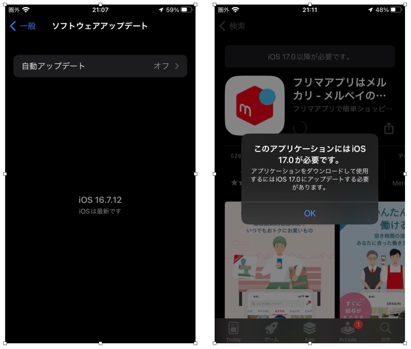 今日(2025年11月13日)時点のメルカリアプリの「最新」は、下の画像の通りに、インストールは出来ませんでした。