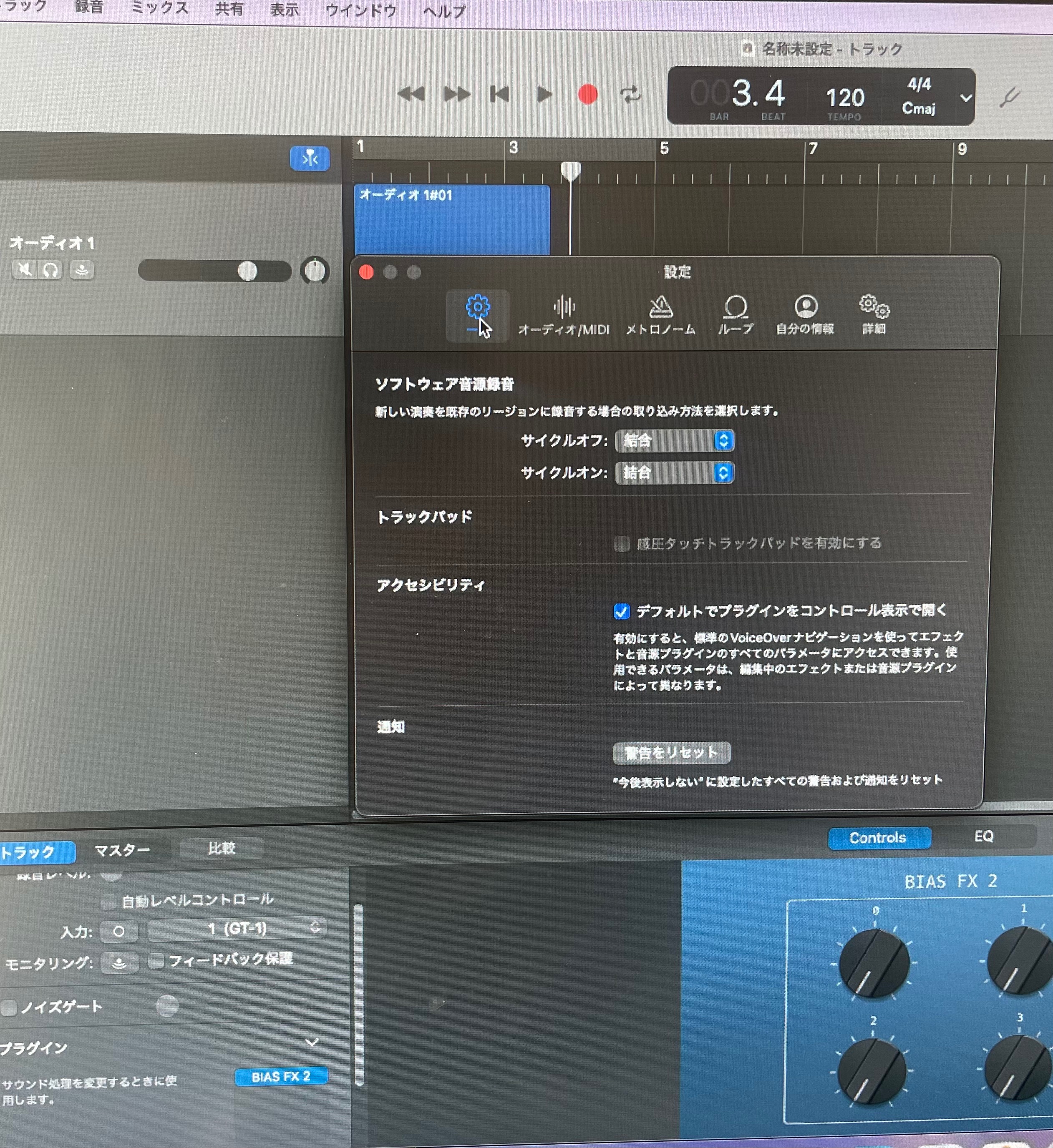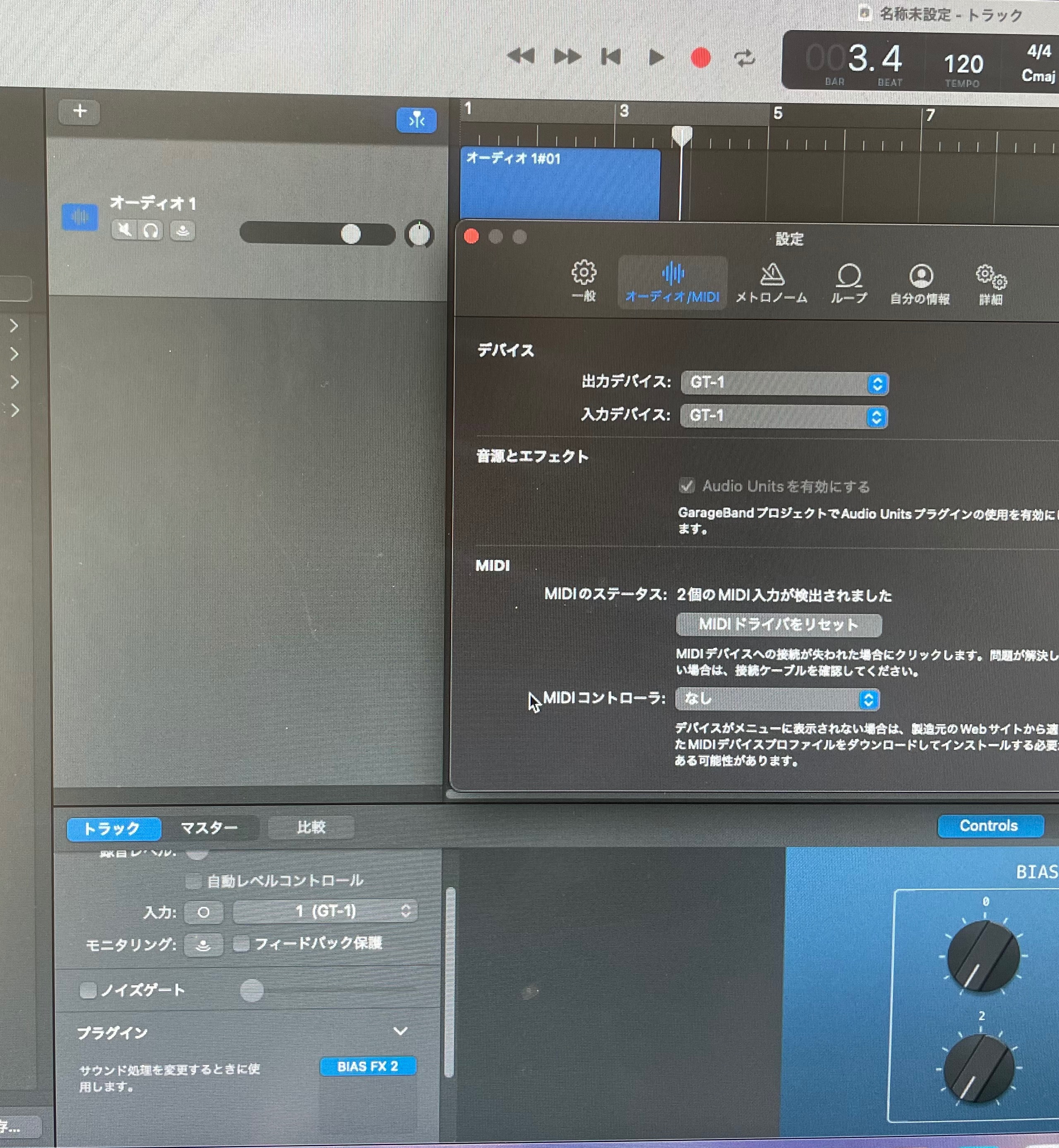 GarageBandでBIAS FX2を使うためにインストールしたのですがGarageBand側でプラグインとして認識されましたが耳で聞いている音と録音された音が違います。