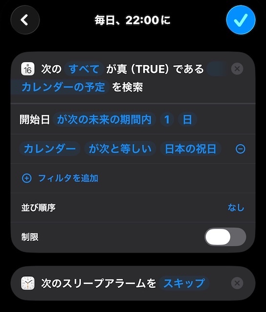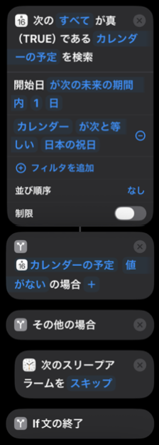 iPhoneのショートカットの中のオートメーションで、カレンダーの日本の祝日に該当する日のアラームをオフにしたい。