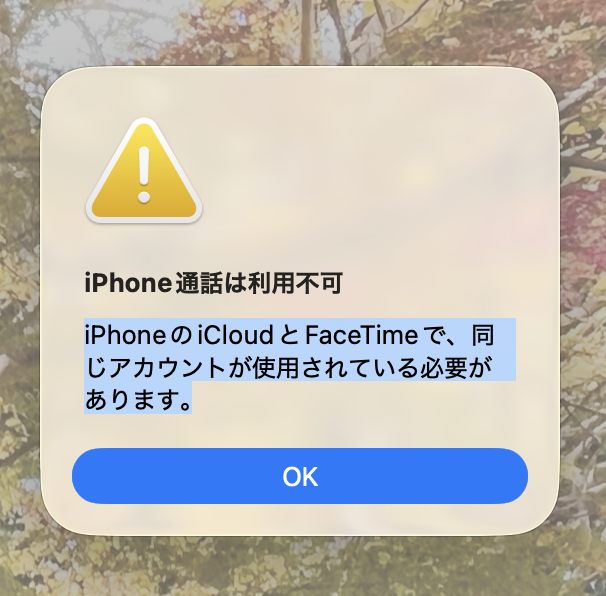 エラー”iPhoneのiCloudとFaceTimeで、同じアカウントが使用されている必要があります。”となります。アカウントは同じでサポートWebで出てくることは一通り試したつもりです。受信はできているので、アカウントは認識されていると思うのですが。。。