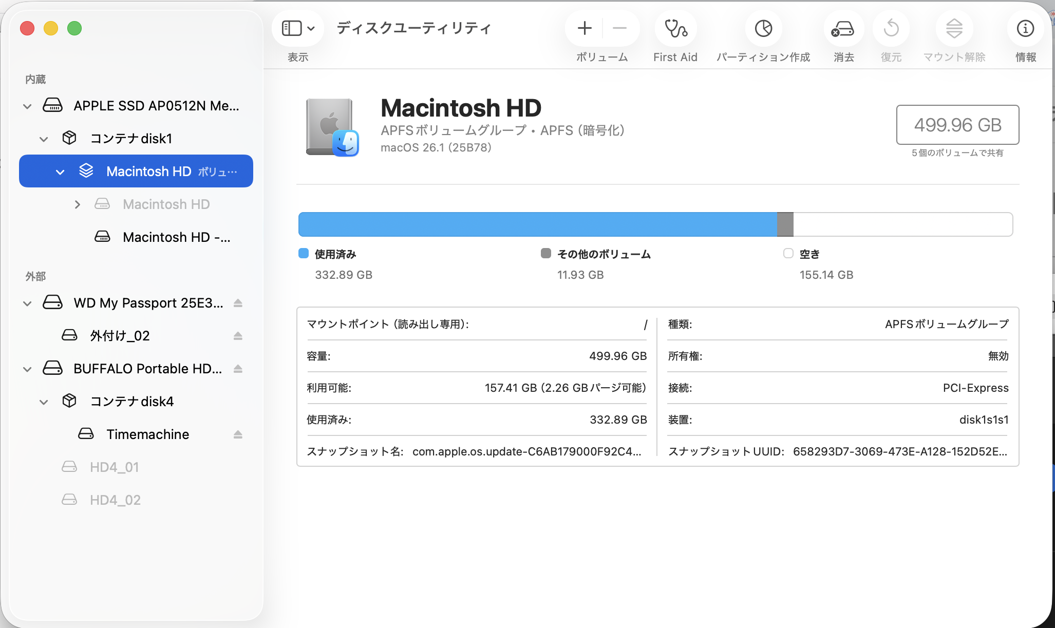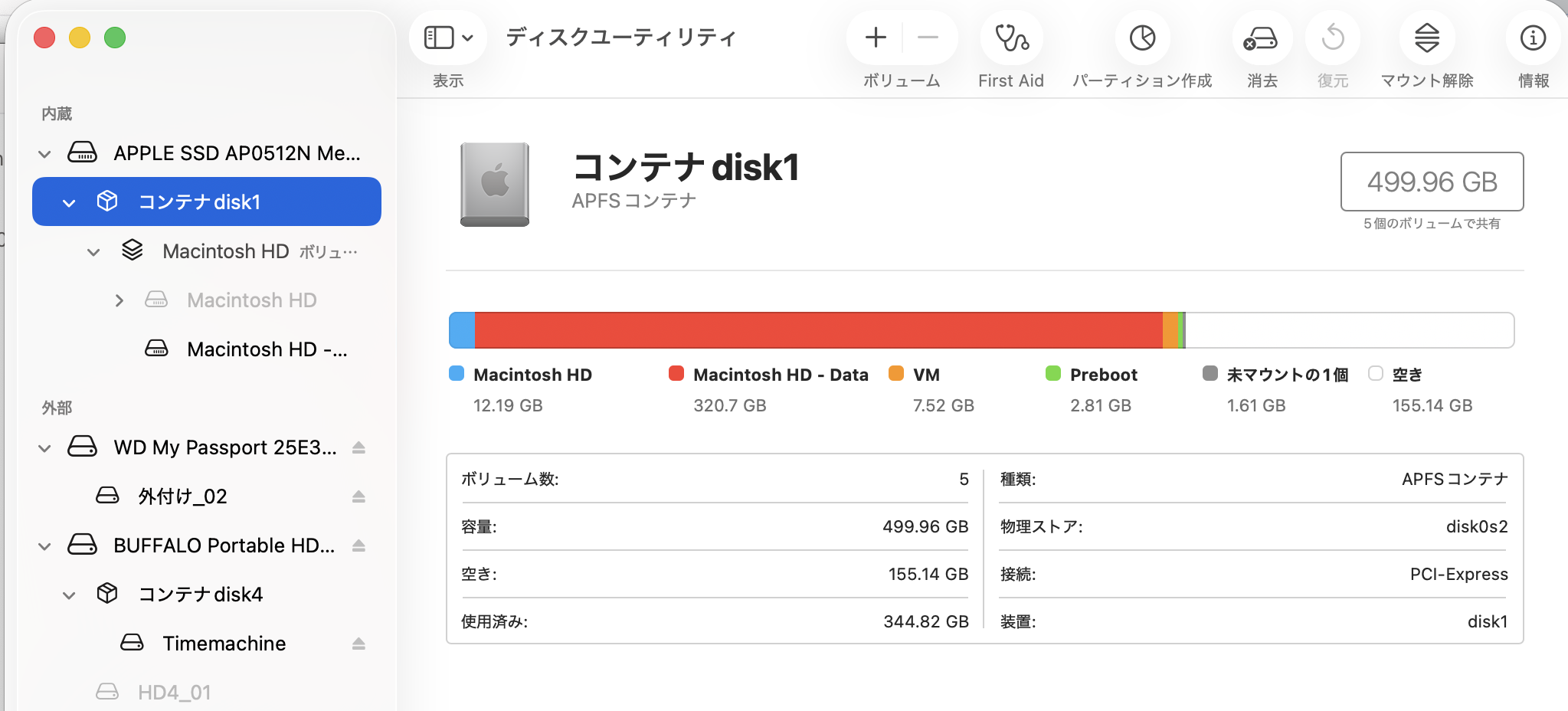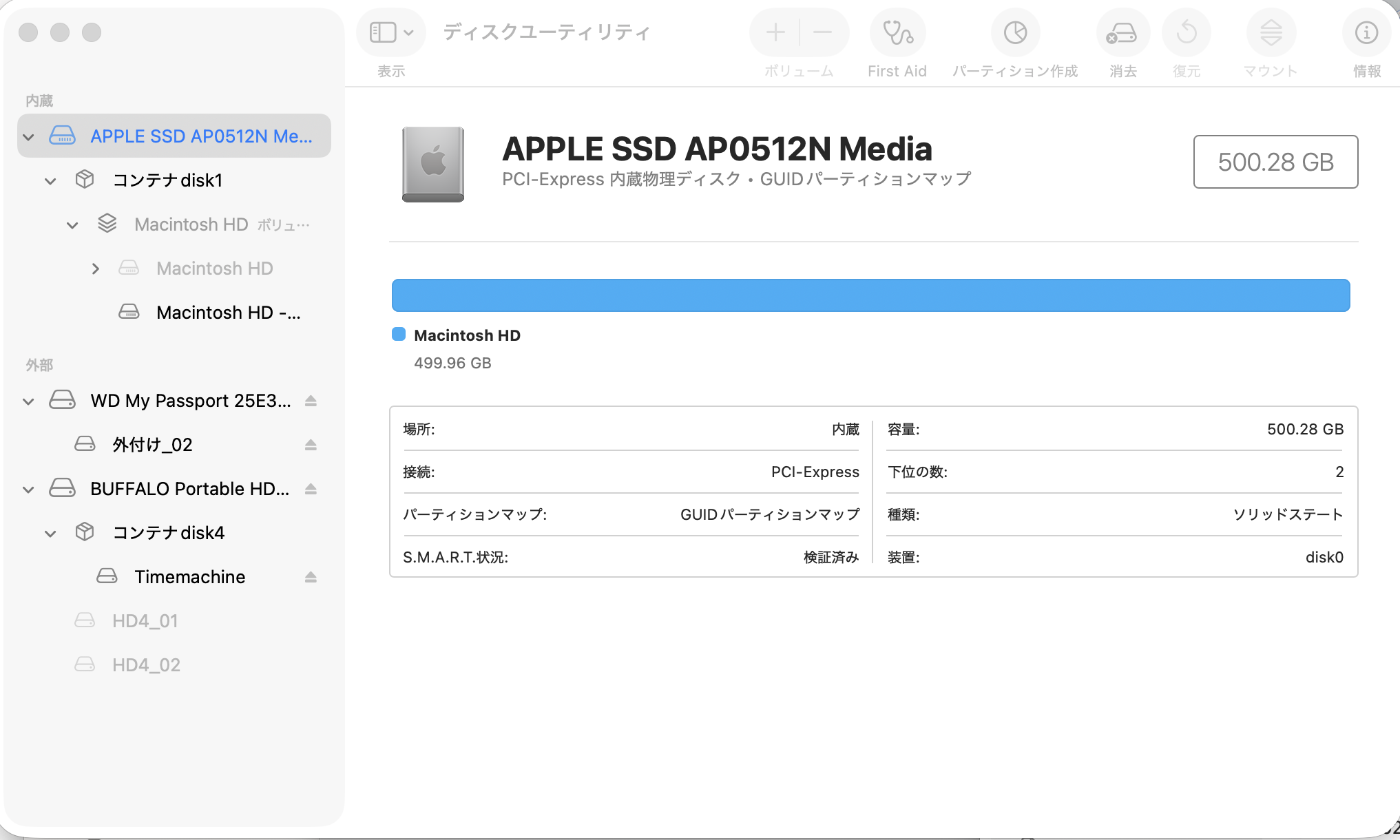 ディスクユーティリティで見てみたところ、「APPLE SSD AP0512N Media」というところが