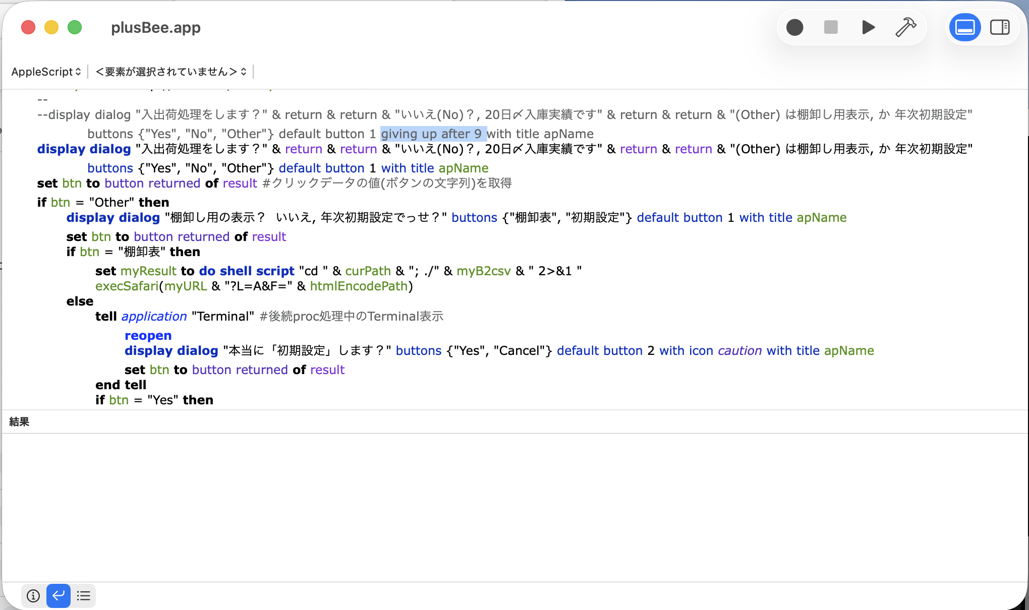 applescriptのdisplay句で "giving up after" を指定すると defaultボタン以外は選べません