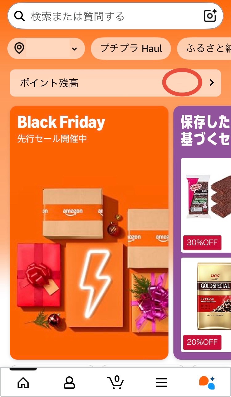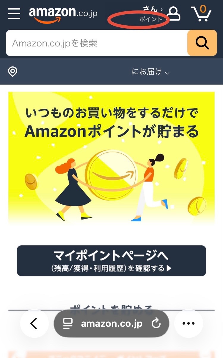 アプリをインストールしているのなら①、していないのならSafariでAmazonサイト②にログインすれば自分のポイントが分かるのではないですか?