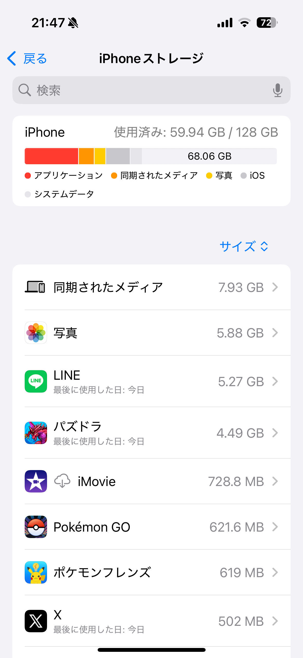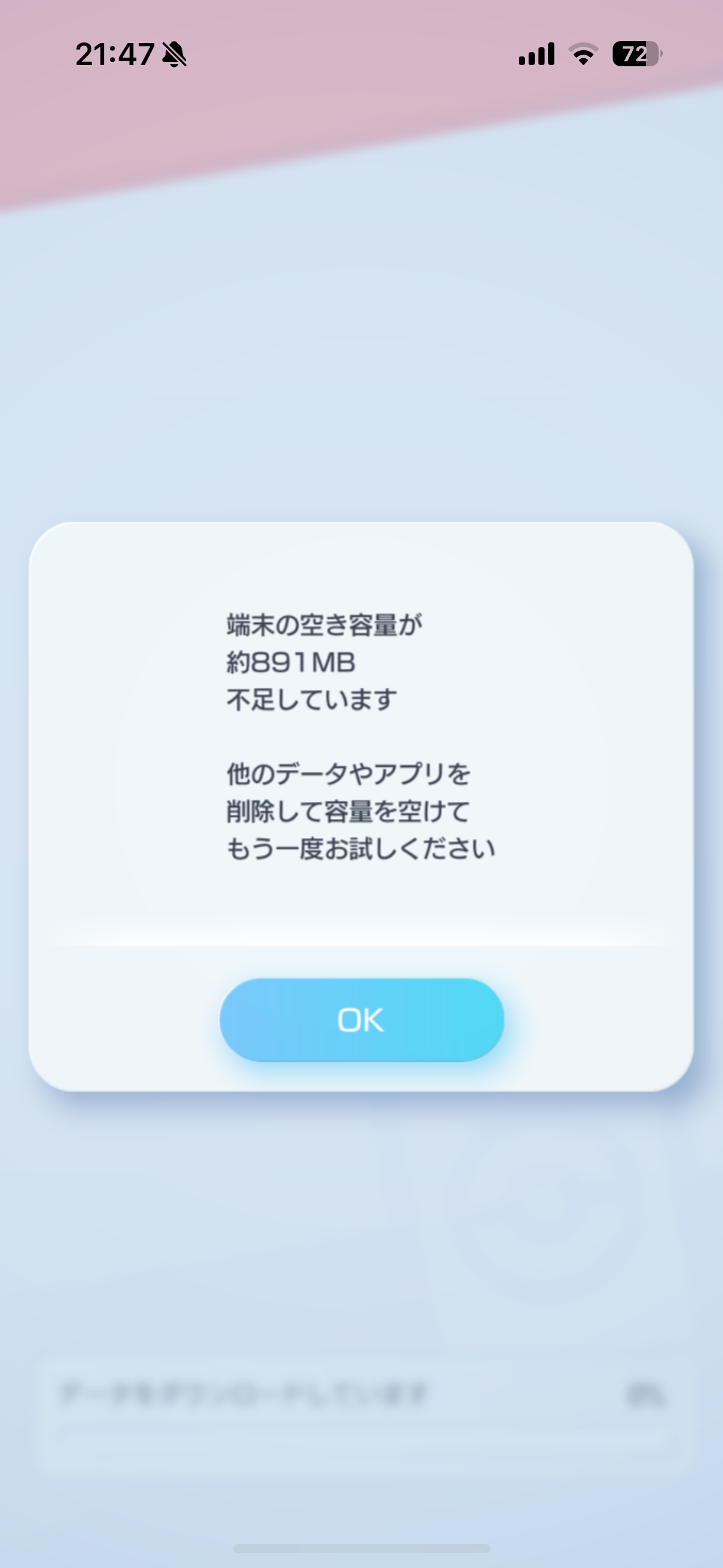 引き継ぎ後、iPhoneのストレージ使用量は60Gで半分ほどしか使用していないのですが、ポケモンカードの更新ファイル2.4Gのうち、891MBの容量が足りないとでます。なぜでしょうか?