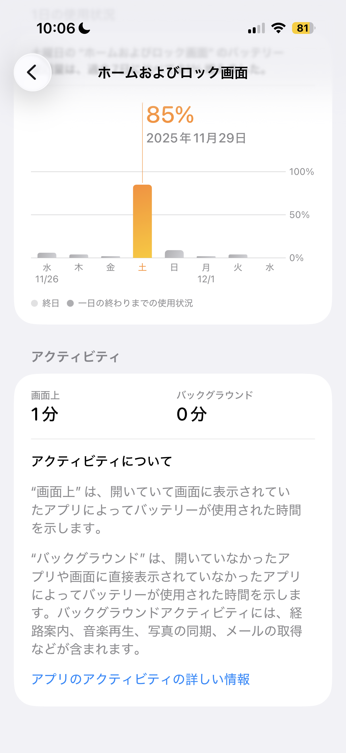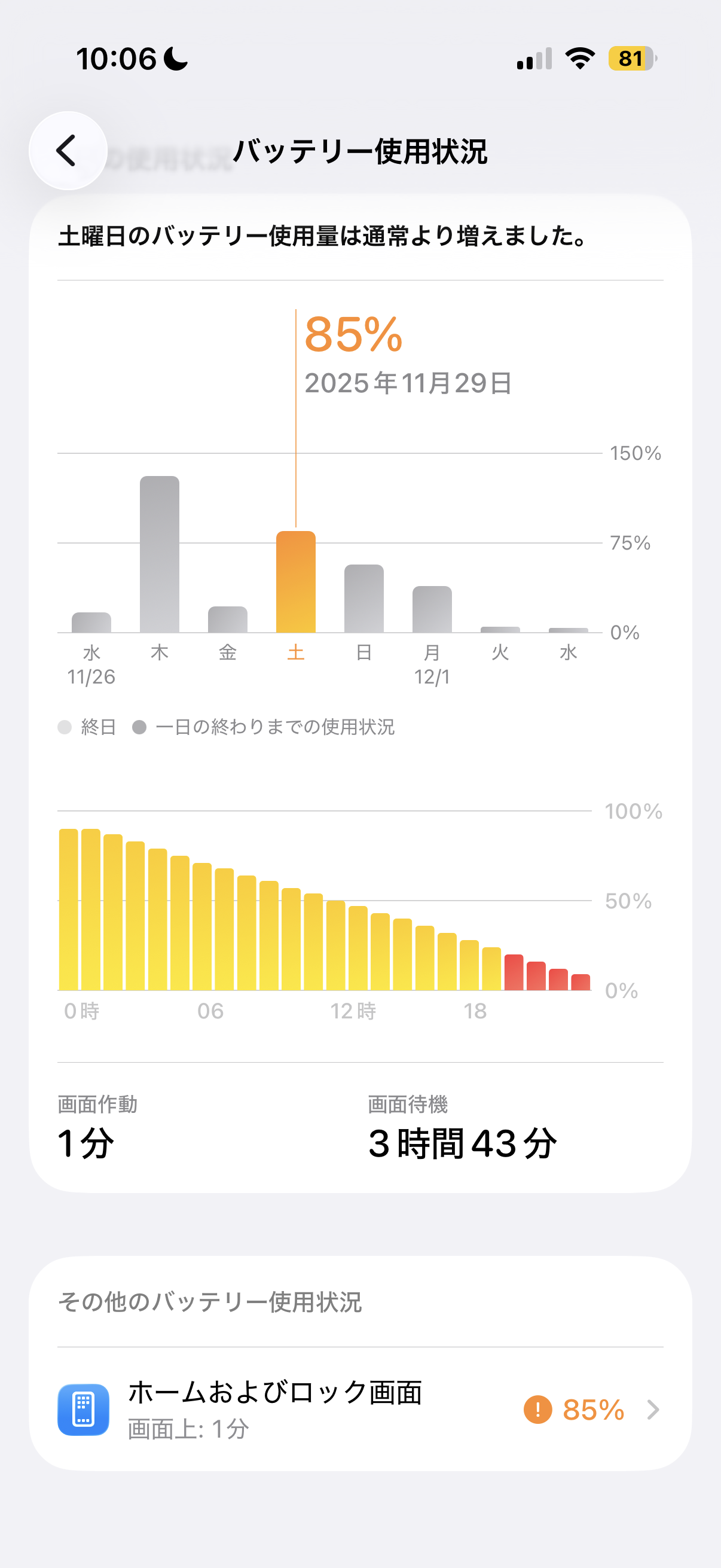 土曜はたった1分画面がオンになった際のロック画面が85%充電を持っていったことになってます。